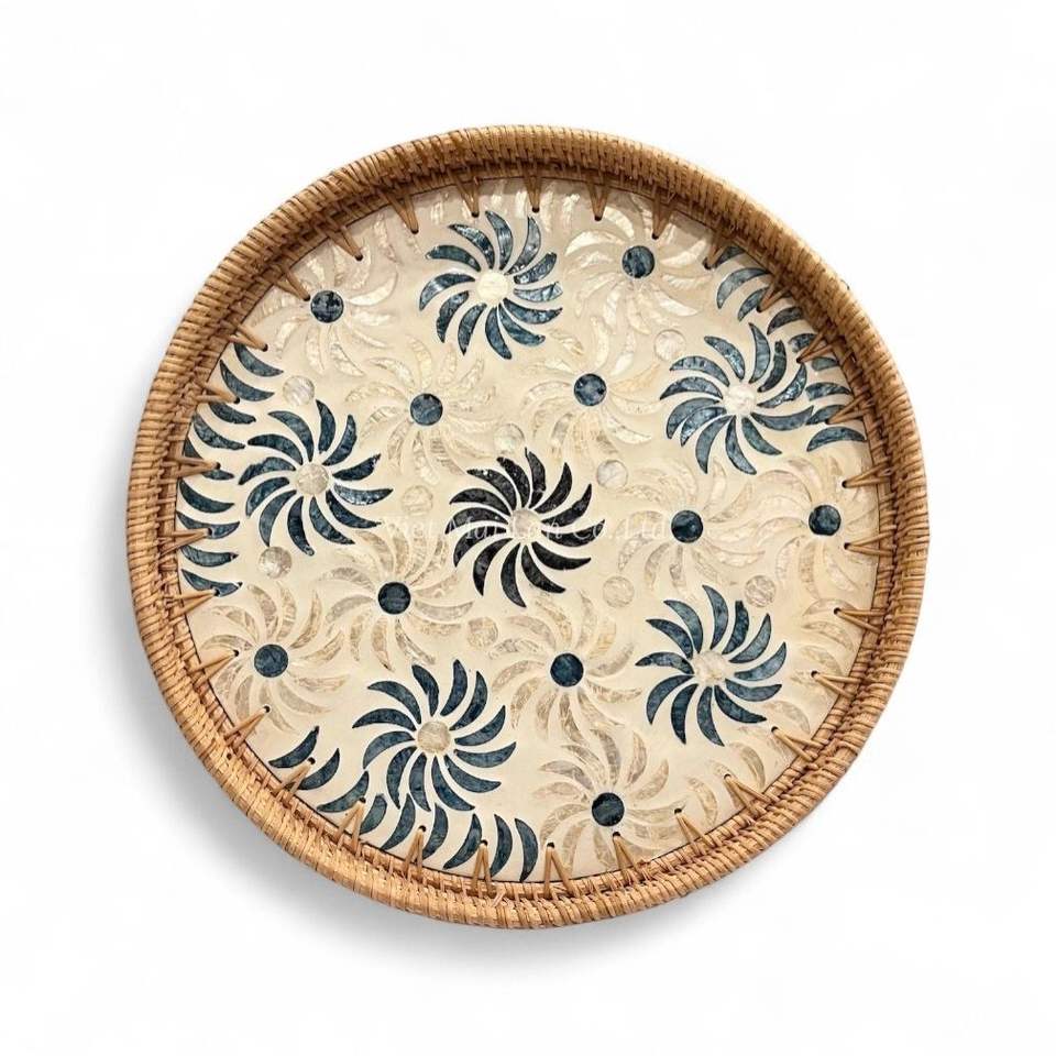 Bandeja de Ratán con Incrustaciones de Nácar, Bandeja Decorativa Hecha a Mano con Incrustaciones de Concha Natural, Ecológica para el Hogar y la Cocina