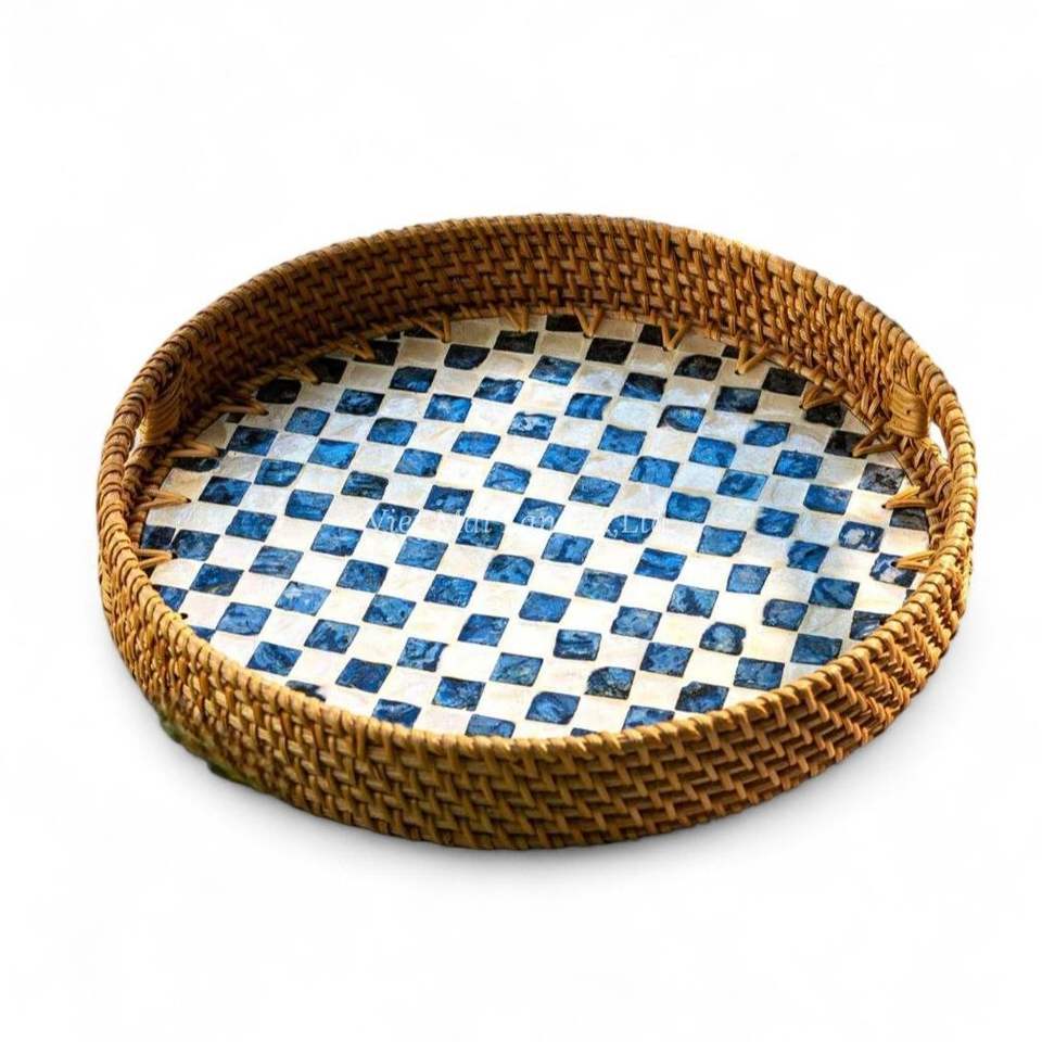 Bandeja Decorativa Hecha a Mano de Ratán con Incrustaciones de Madreperla, Bandeja con Incrustaciones de Concha Natural Ecológica para Uso en Mesa del Hogar