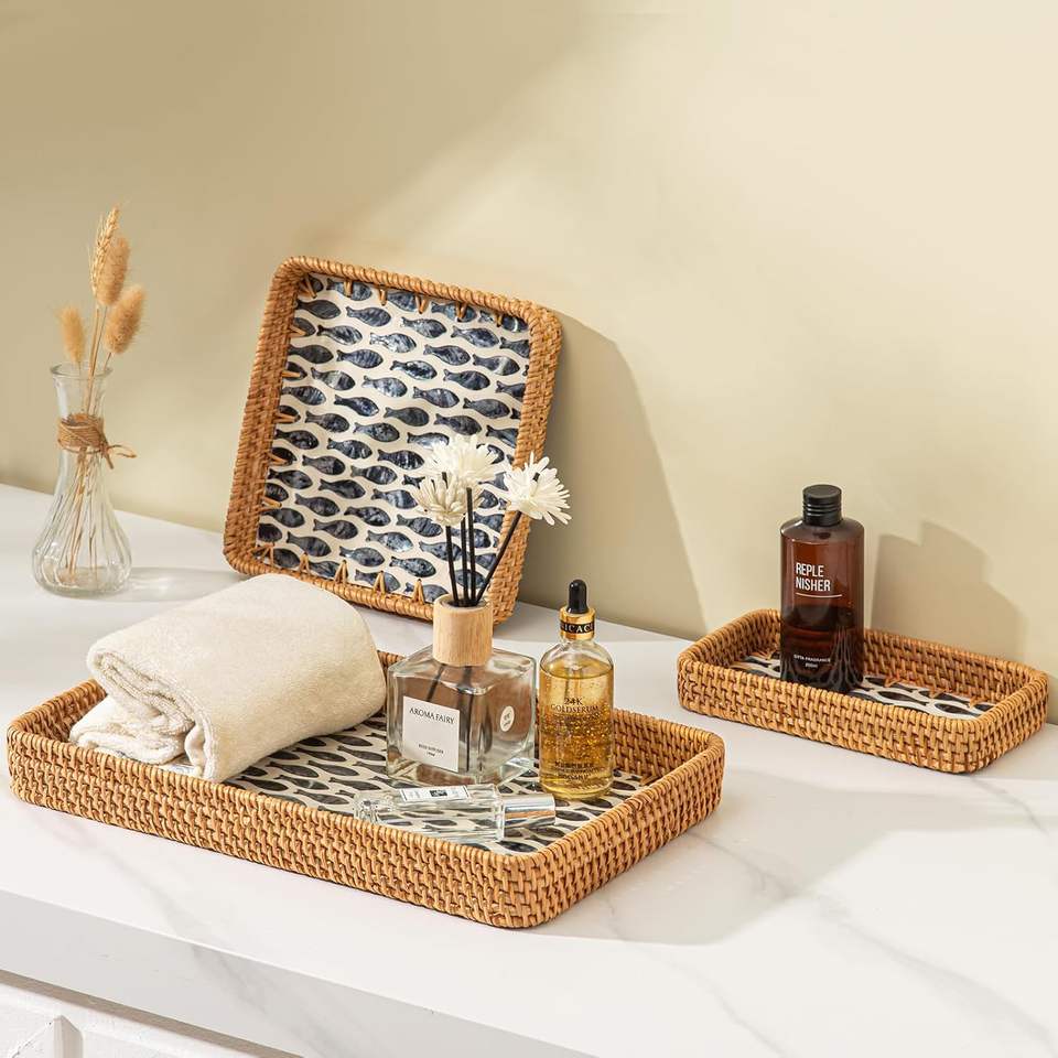 Bandeja de Servicio de Ratán, Juego de 3 Cestas Rectangulares, Cestas de Almacenamiento y Organización de Mimbre, Bandeja Tejida Decorativa Natural