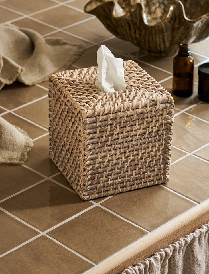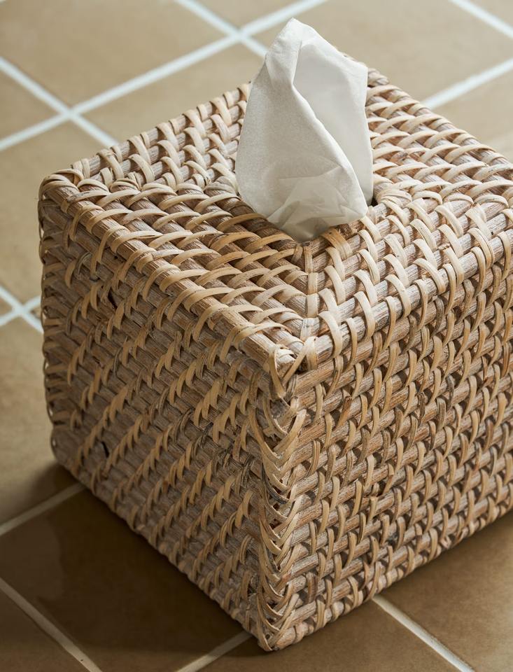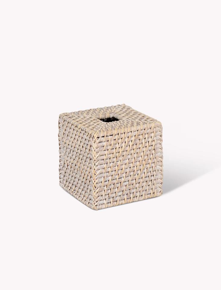 Nombre:Caja de pañuelos cuadrada de ratán, color blanco. Tamaño: Ancho 14 cm x Alto 15 cm.