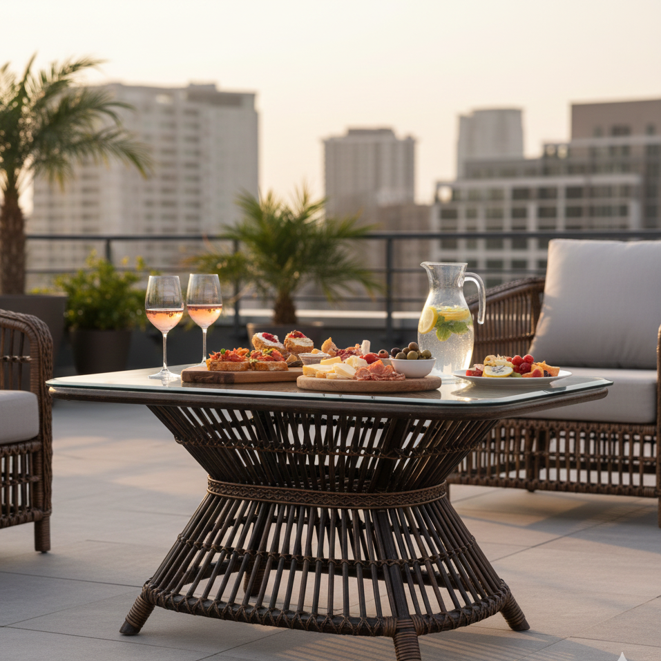 Mesa de Ratán Marrón Oscuro Hecha a Mano, Ecológica, Duradera, Estilo Minimalista Rústico para Exteriores, Comedor, Hotel y Sala de Estar