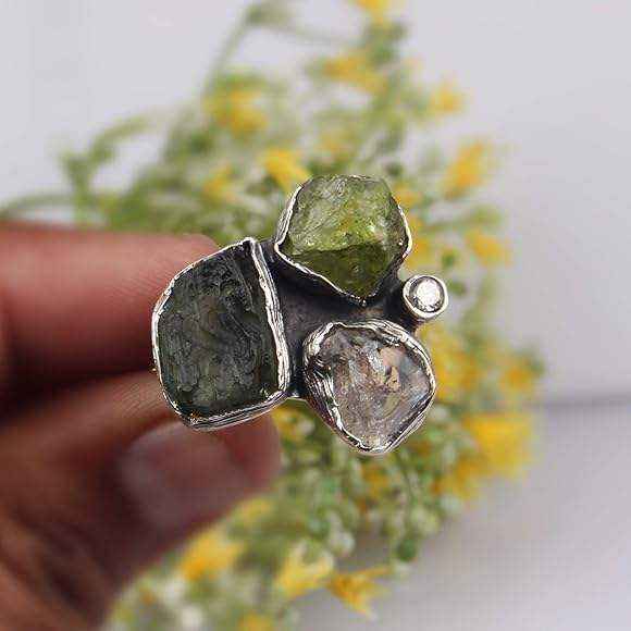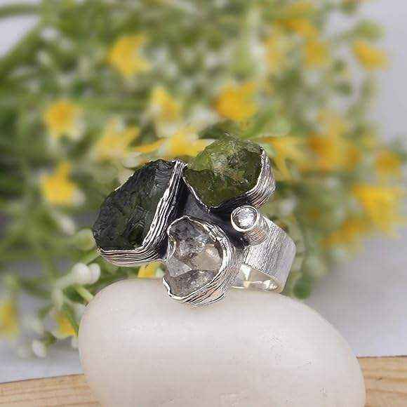 Anillo de diamante Herkimer de moldavita cruda Anillo de piedra de declaración de plata esterlina para ella