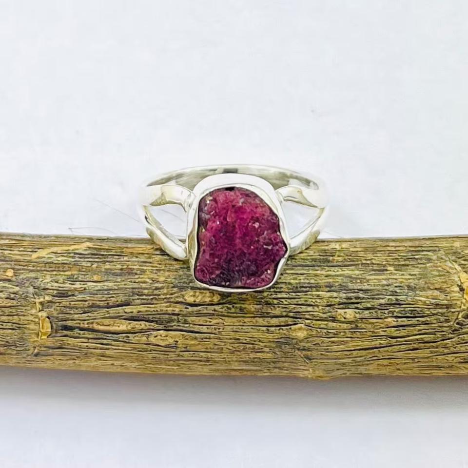 Anillo de rubí rojo crudo 925, banda de forma orgánica de plata de ley sólida, piedra preciosa roja Natural, joyería artesanal Bohemia, anillos orgánicos finos