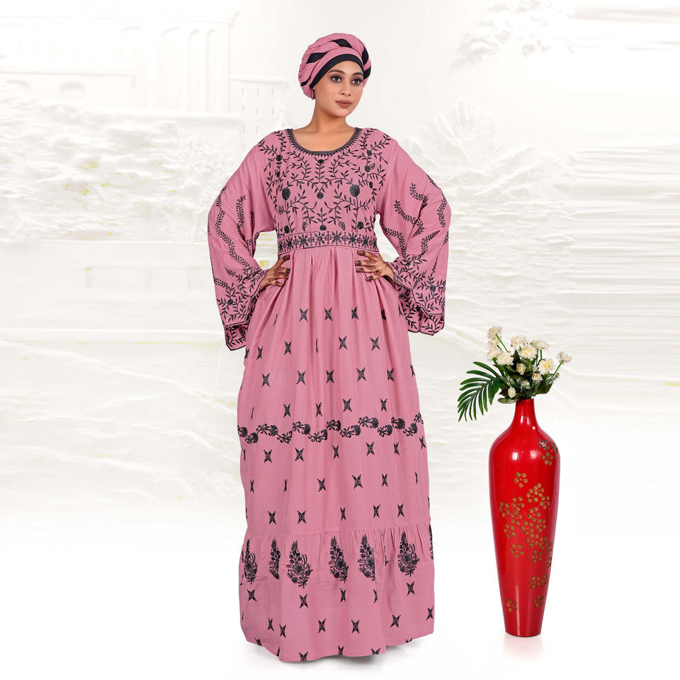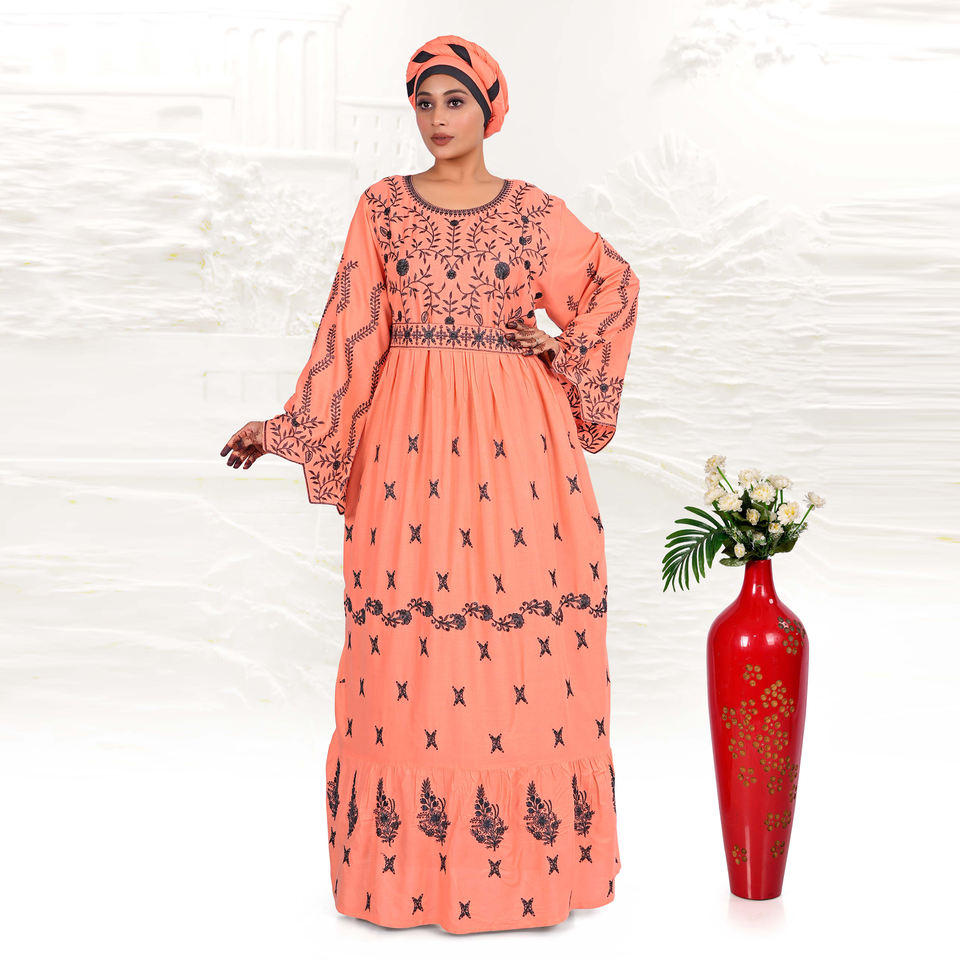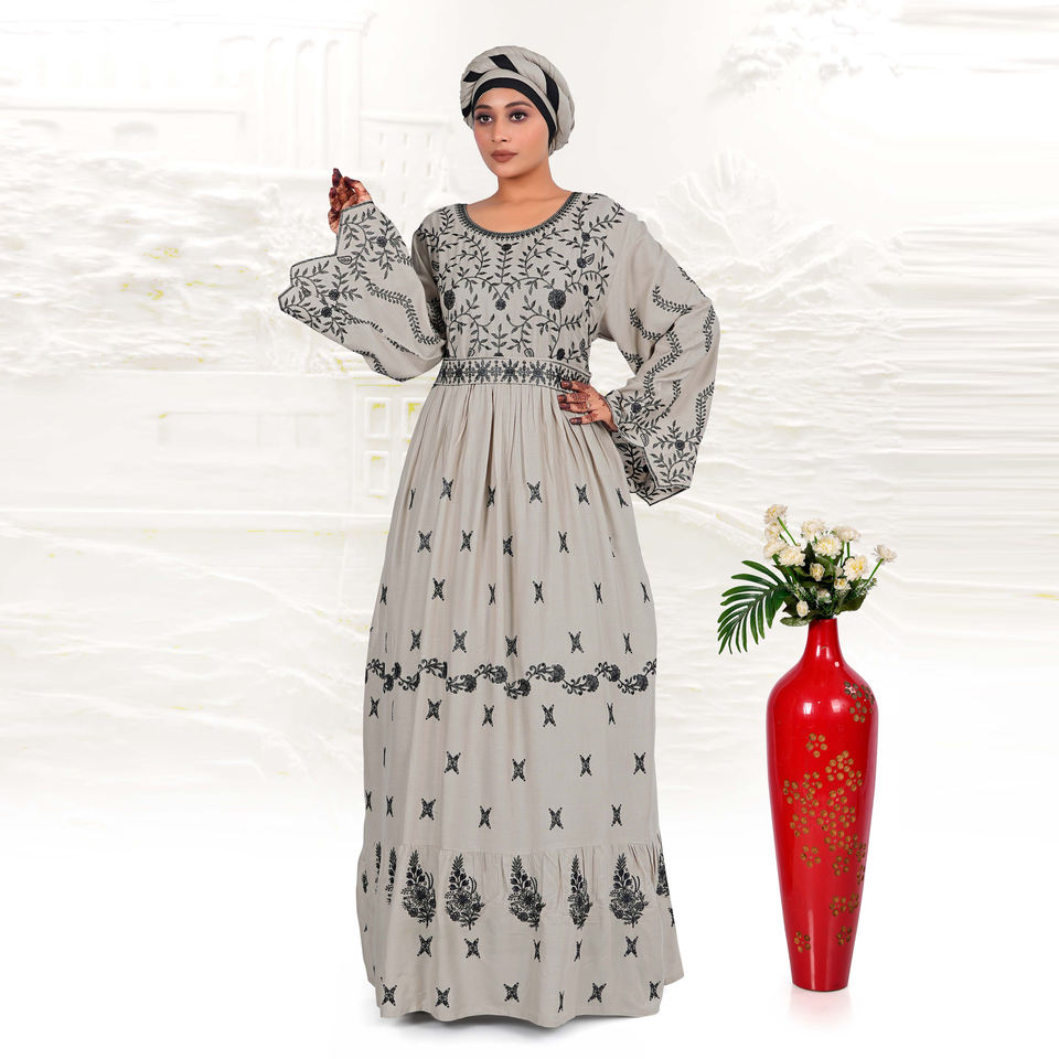 Caftán de Rayón con Bordado Detallado, Mangas Acampanadas, Cintura Definida y Elegante Diseño de Silueta Larga hasta el Suelo