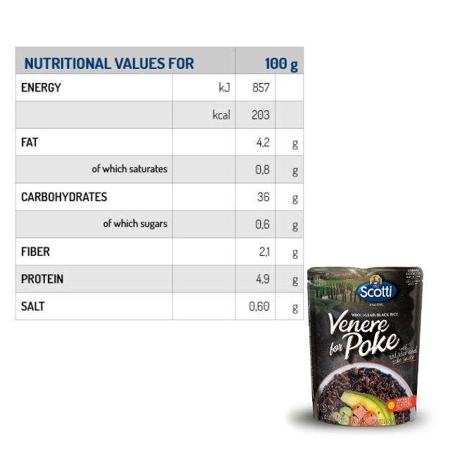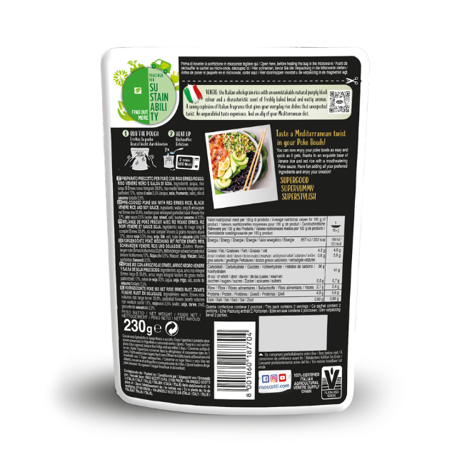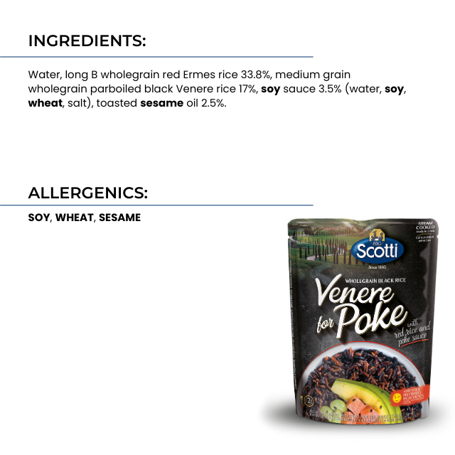 Ingredients:red rice 33.8%, black Venere rice 17%, soy sauce 3.5%, sesame oil 2.5%