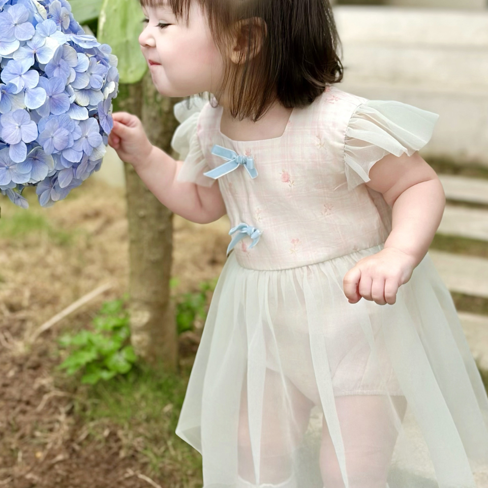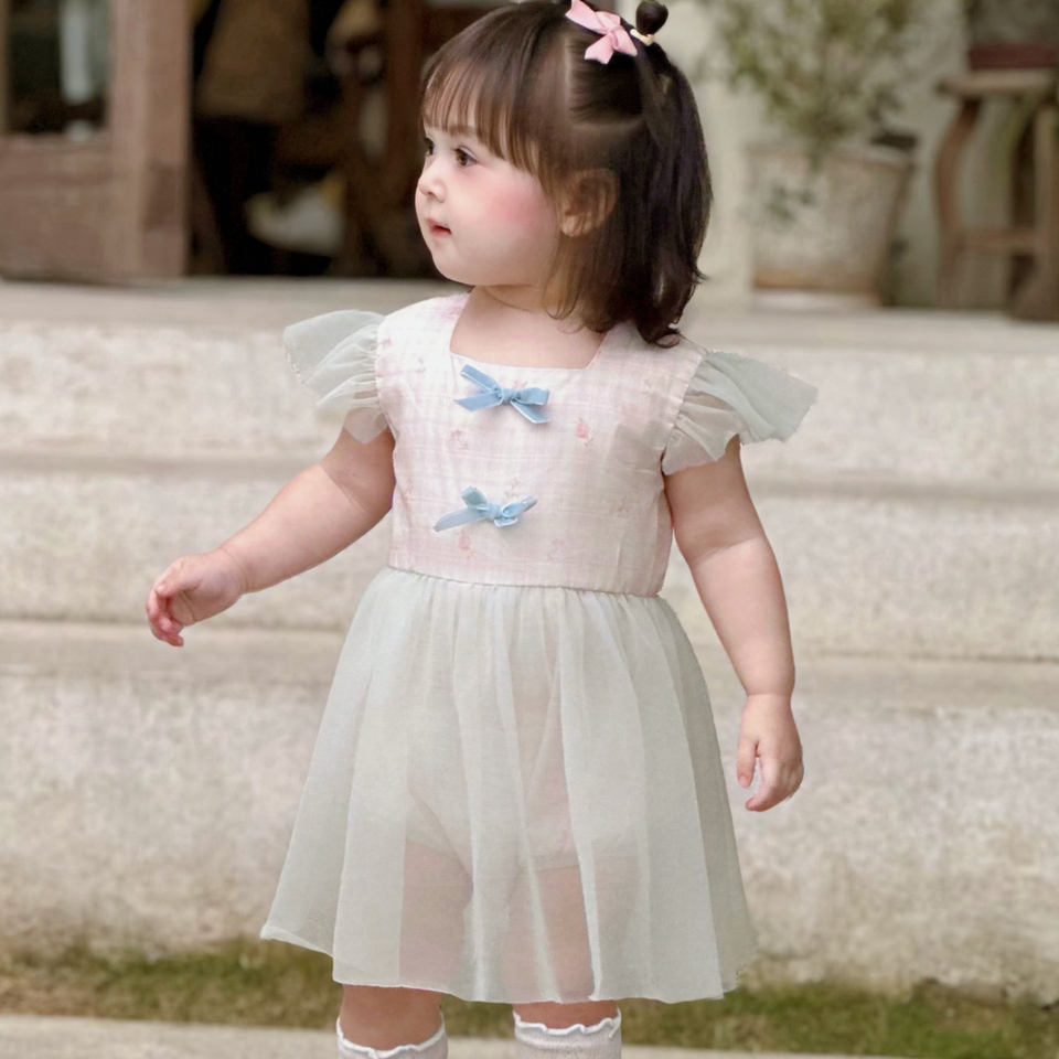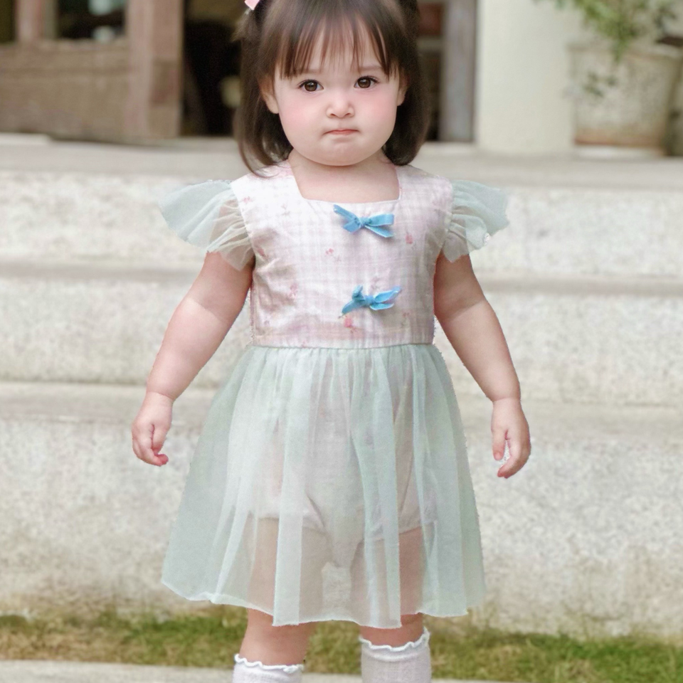 Listo para enviar: Mono de niña con estampado floral, estilo minivestido, de verano, manga corta, ropa para bebé - RKS02