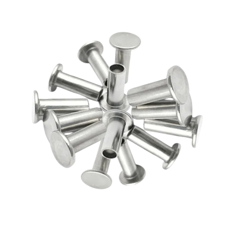 Remaches semi-tubulares de acero listos para enviar, sujetadores de embalaje personalizados, fabricante, exportador profesional, remaches tubulares de cabeza de armazón