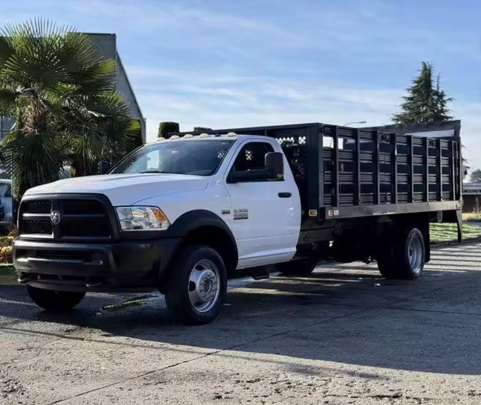 Camión de plataforma plana RAM 4500 usado de 2015, listo para trabajar, con plataforma elevadora Waltcoo y plataforma de 16 pies, LHD/RHD, envío a todo el mundo