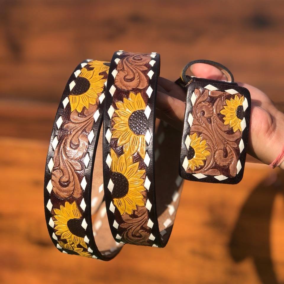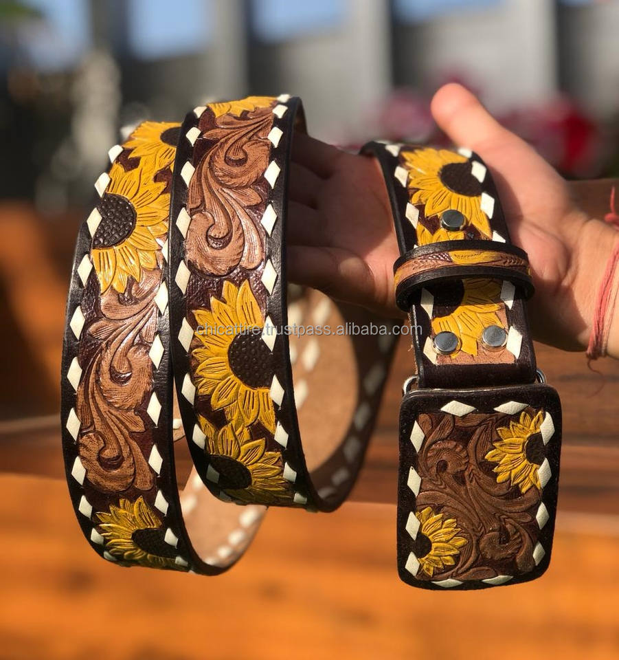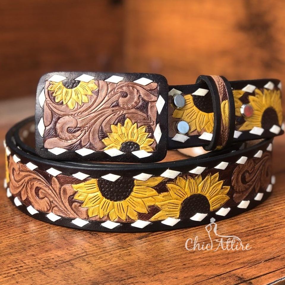 Cinturón Occidental de Cuero de Grano Completo Hecho a Mano, Correa de Hebilla Extraíble Unisex de Girasol con Estilo Occidental