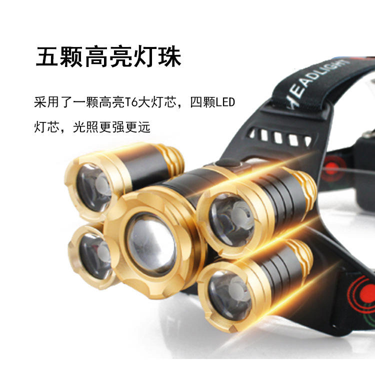 Linterna Frontal LED Recargable XML 5 LED, Lámpara Frontal T6, Linterna con Batería 18650, Ideal para Camping y Pesca