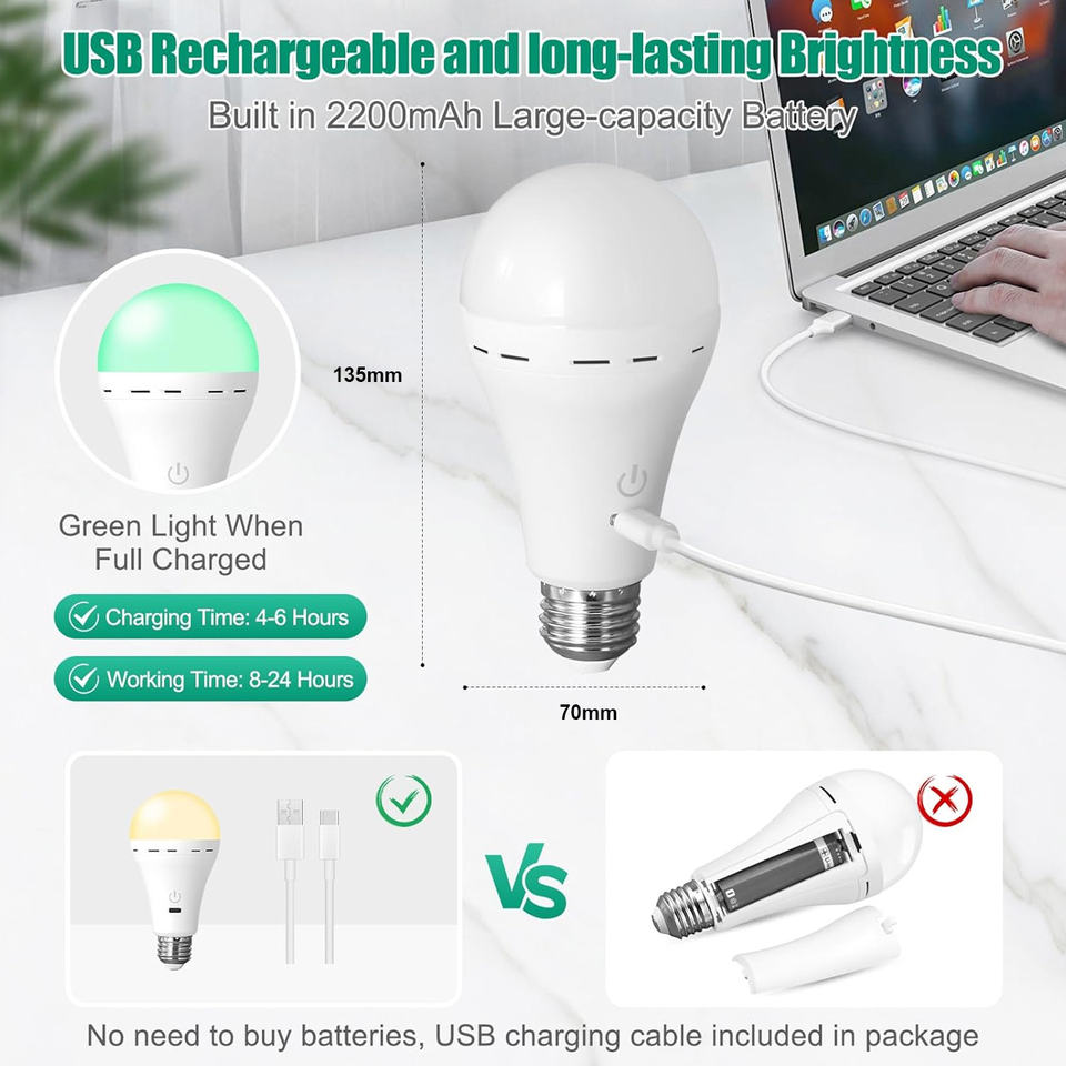 Bombillas LED Recargables con Control Remoto, Portátiles, USB, E27, 3 Colores, Regulables, Inalámbricas, con Batería de Emergencia, Súper Brillantes