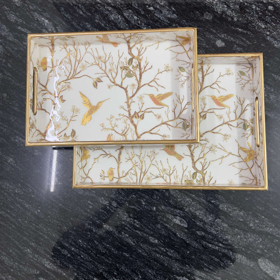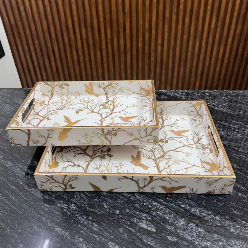 Bandeja de servicio de mesa de madera con estampado dorado de esmalte rectangular Precio al por mayor Fabricante DE LA India Bandeja de servicio hecha a mano de nuevo estilo