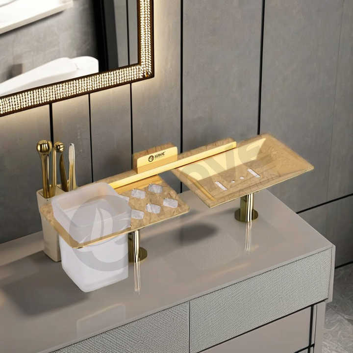 Jabonera rectangular de acero inoxidable PVD dorado con soporte para vaso, accesorio de baño montado en la pared para interiores de lujo