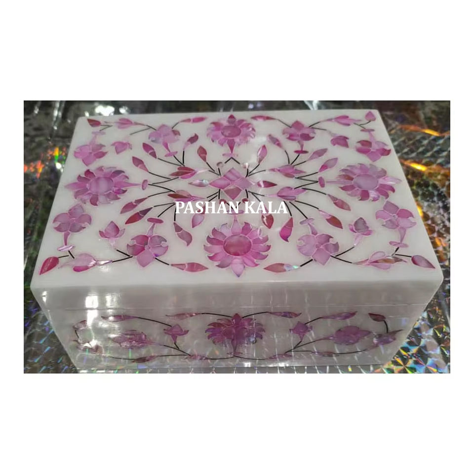 Forma de rectángulo Diseño increíble Mármol blanco Rosa Madre de perla Incrustaciones Joyero Acabado fino Mármol Caja de regalo de negocios