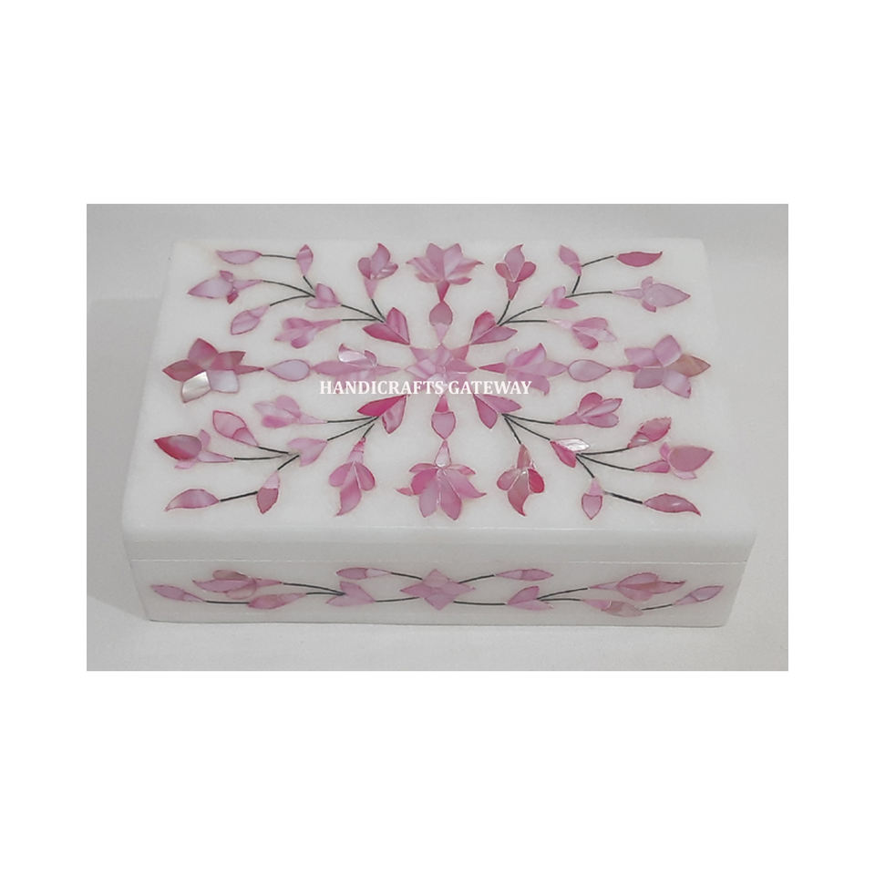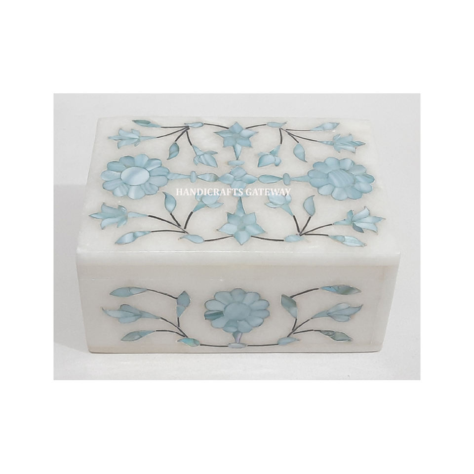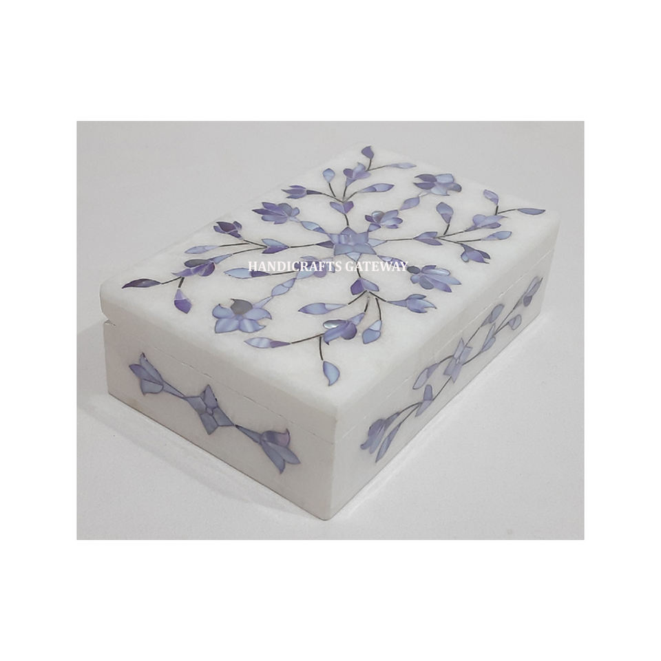 Caja de Joyería Rectangular de Mármol Blanco Natural con Incrustaciones de Nácar Azul, Diseño Floral Hecho a Mano, Ideal para Regalo Empresarial
