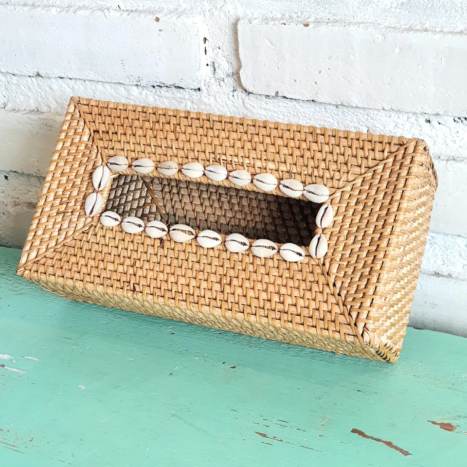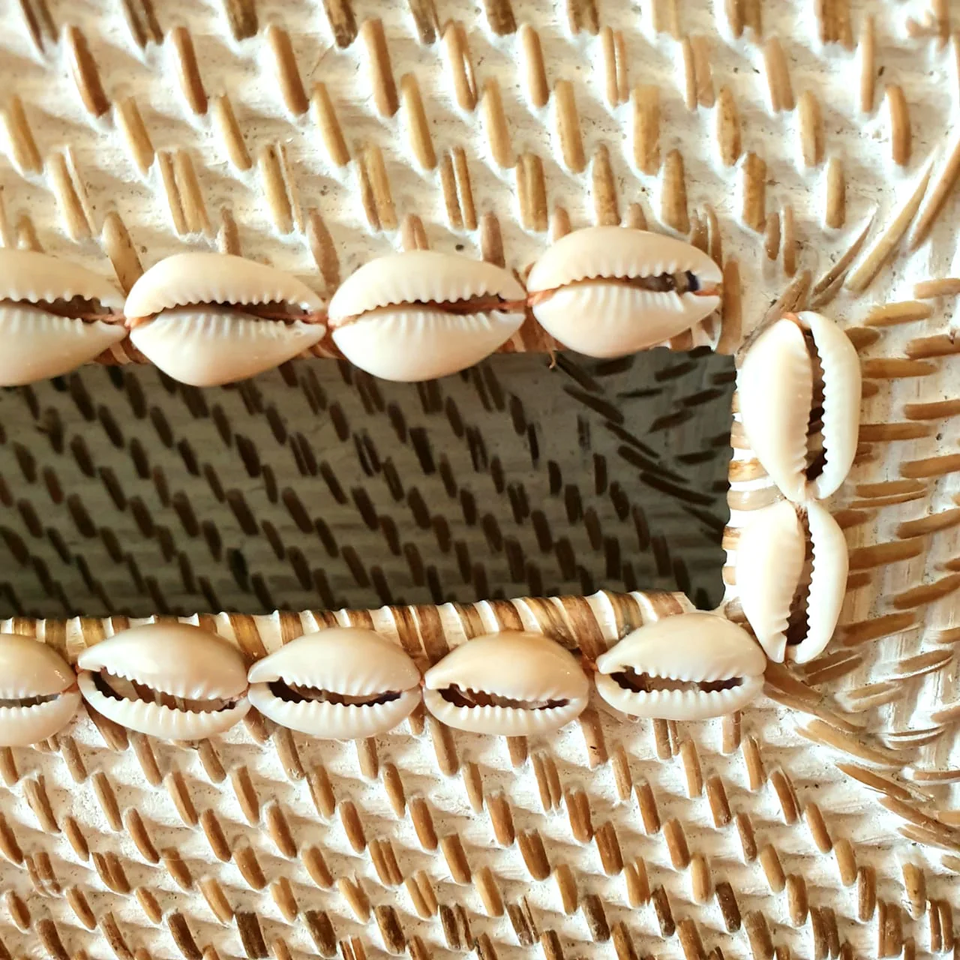 Caja rectangular para pañuelos de ratán con concha. Tamaño: L10,6 x W5,5 x H3 pulgadas.