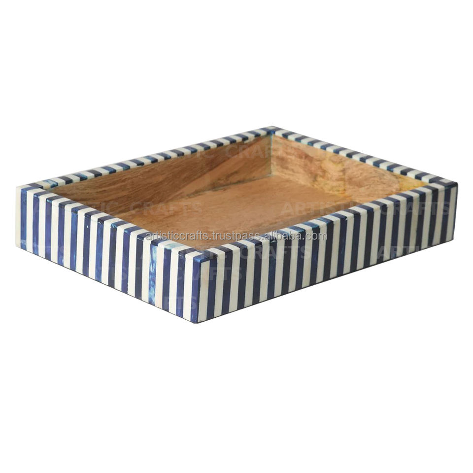 Bandeja Rectangular con Incrustaciones de Hueso Azul y Blanco Hecha a Mano Vintage Sirviendo Madera Hogar Cocina Mesa Decoración Diseño de Rayas Bandeja