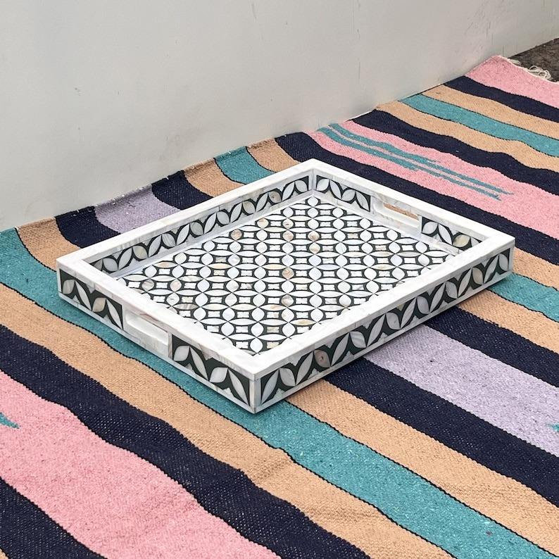 Bandeja Rectangular con Incrustaciones de Hueso y Diseño Floral, Decoración para el Hogar