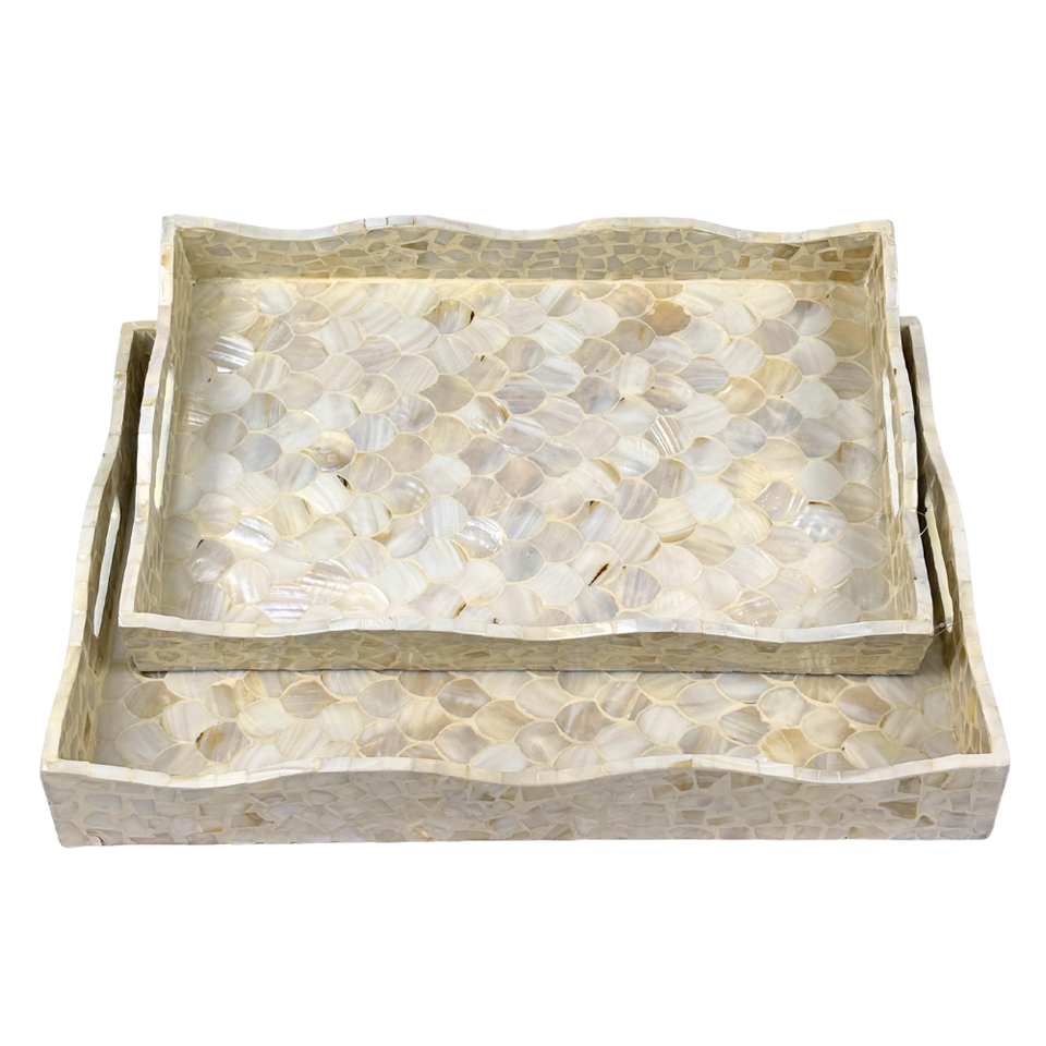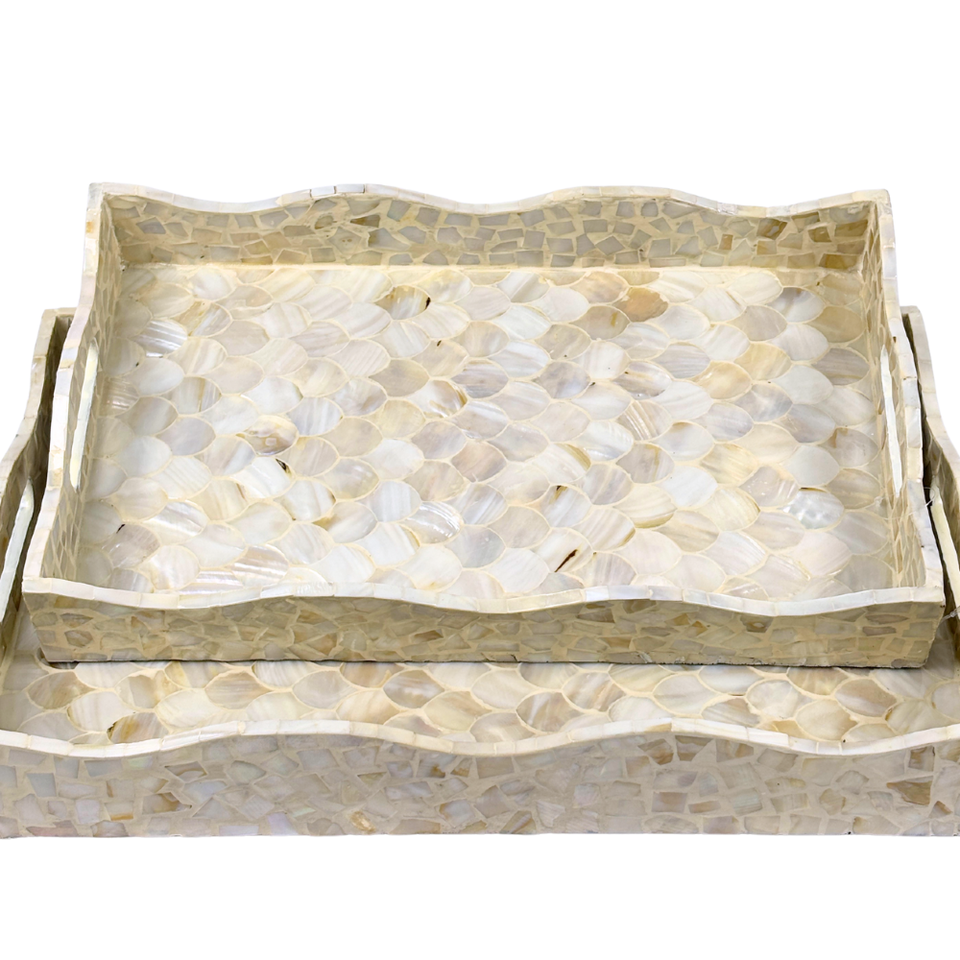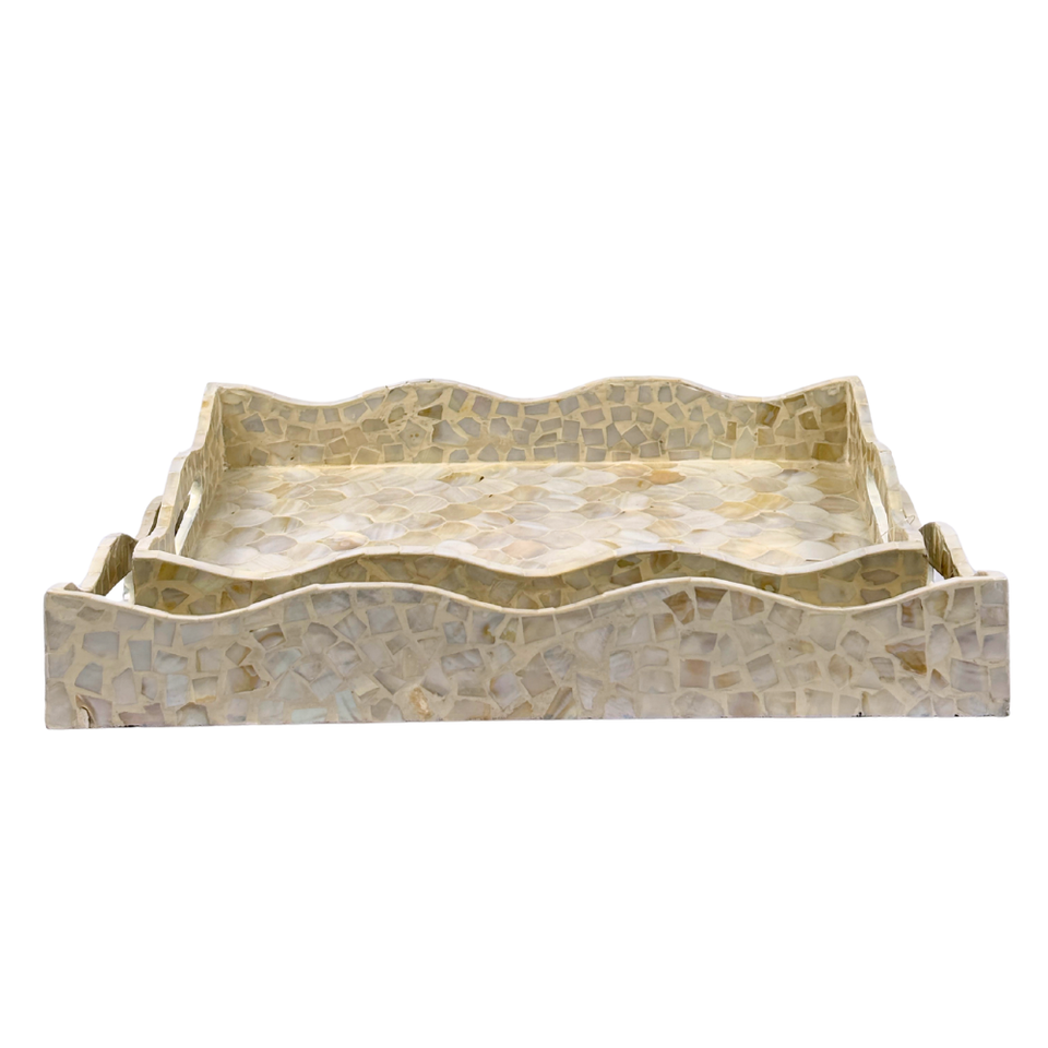 Bandeja Rectangular con Incrustaciones de Madreperla Capiz, Borde Ondulado, Diseño de Conchas Hecho a Mano, Decorativa, de MDF Sostenible, Acabado Pulido, Elegante