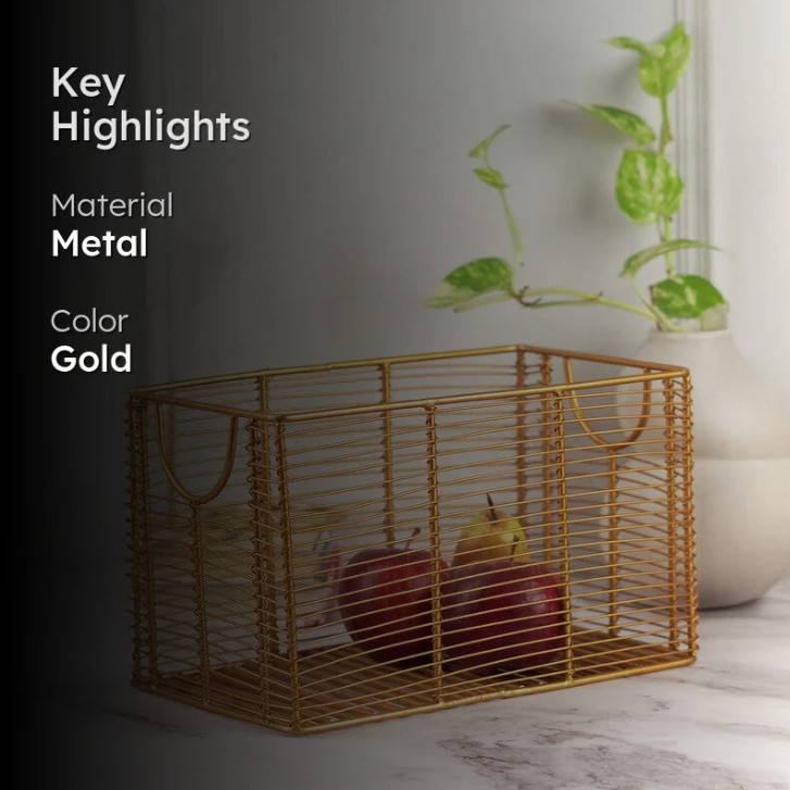 Cesta de Almacenamiento Rectangular de Alambre Dorado | Cesta de Metal para Frutas | Almacenamiento Moderno para Cocina y Hogar