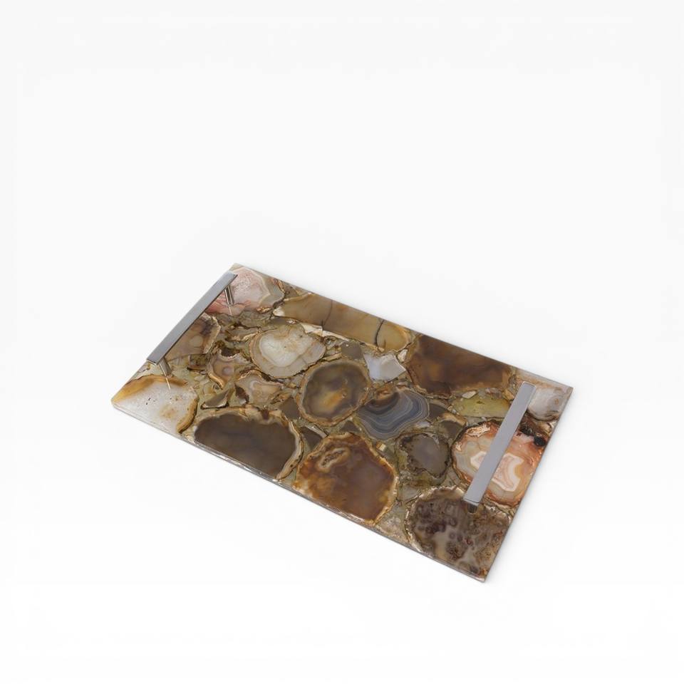 Bandeja Rectangular de Ágata Natural Gris Claro con Textura de Cristal de Nube Suave y Asas de Barra de Metal Dorado