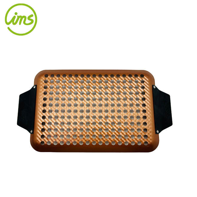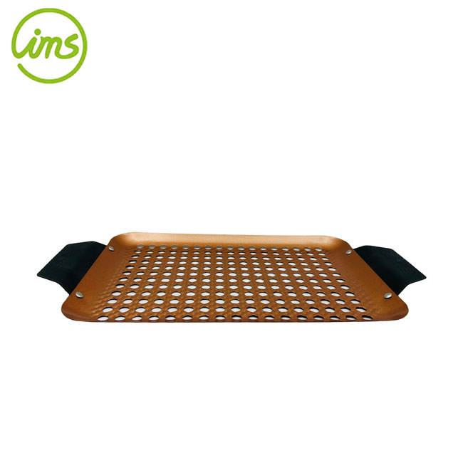 Bandeja rectangular antiadherente para barbacoa con asa de material metálico