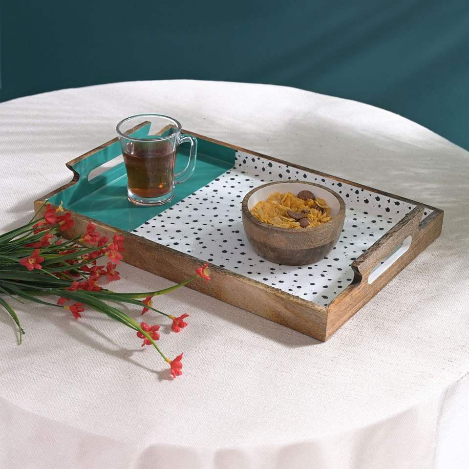 Bandeja rectangular de madera con bordes altos para transportar con seguridad platos, vasos y tazones.
