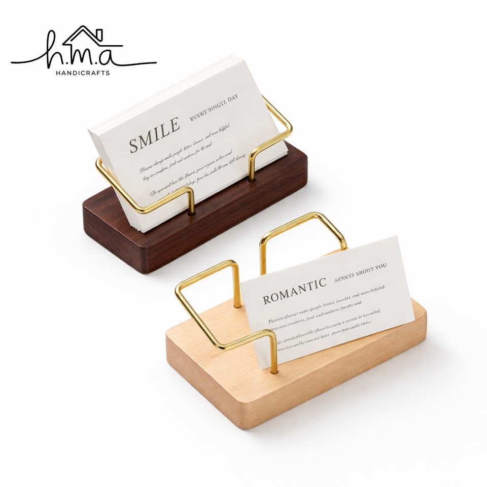 Porta Tarjetas de Visita Rectangular con Base de Madera y Marco Metálico Dorado, Organizador de Escritorio Minimalista para Tarjetas de Visita, Moderno