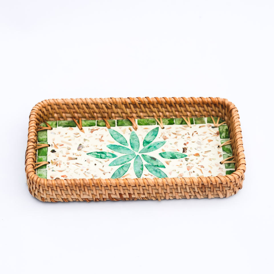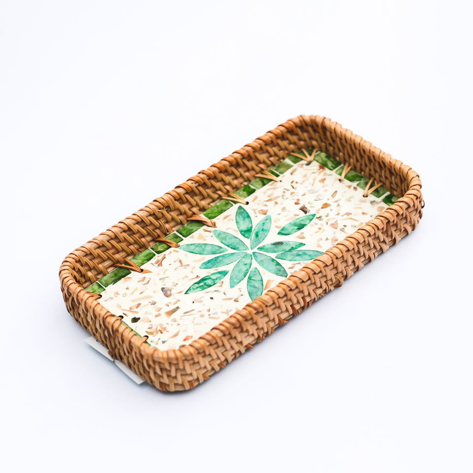 Bandeja Rectangular de Ratán Tejido con Incrustaciones de Madreperla y Diseño de Flor de Loto, Estilo Boho, Costero, Artesanal de Vietnam