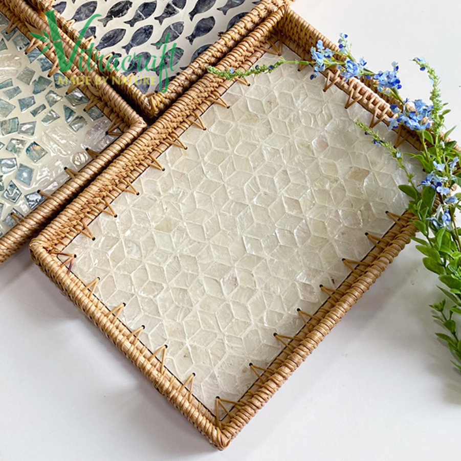 Bandeja de ratán rectangular con asa Bandeja de ratán rectangular con perlas incrustadas hechas a mano Ayuda a exhibir productos más hermosos