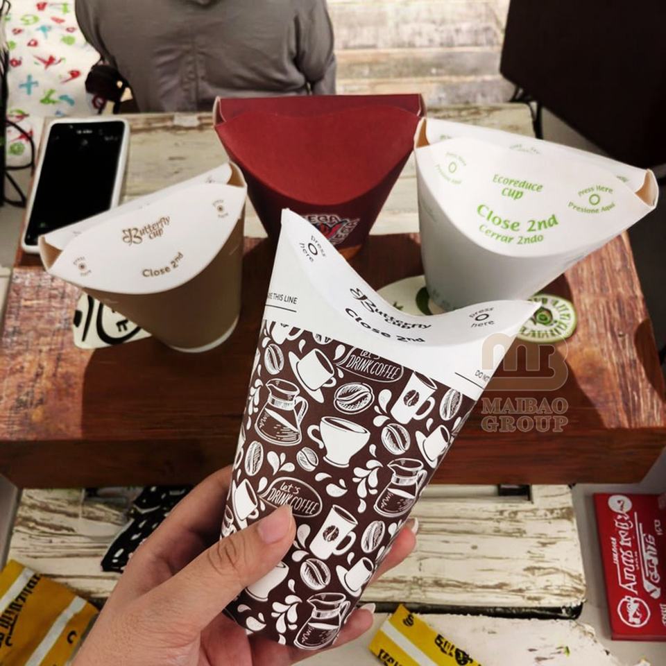 Tazas de café de papel de pared doble reciclables de 16oz PLA a base de agua recubierto con mariposa de nuevo diseño para vino y bebidas carbonatadas