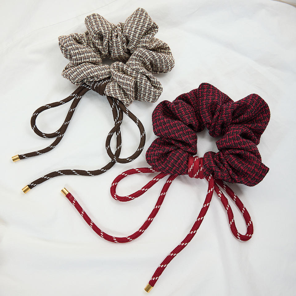 Coletero de tela a cuadros rojo y marrón con lazo, accesorio informal para cola de caballo
