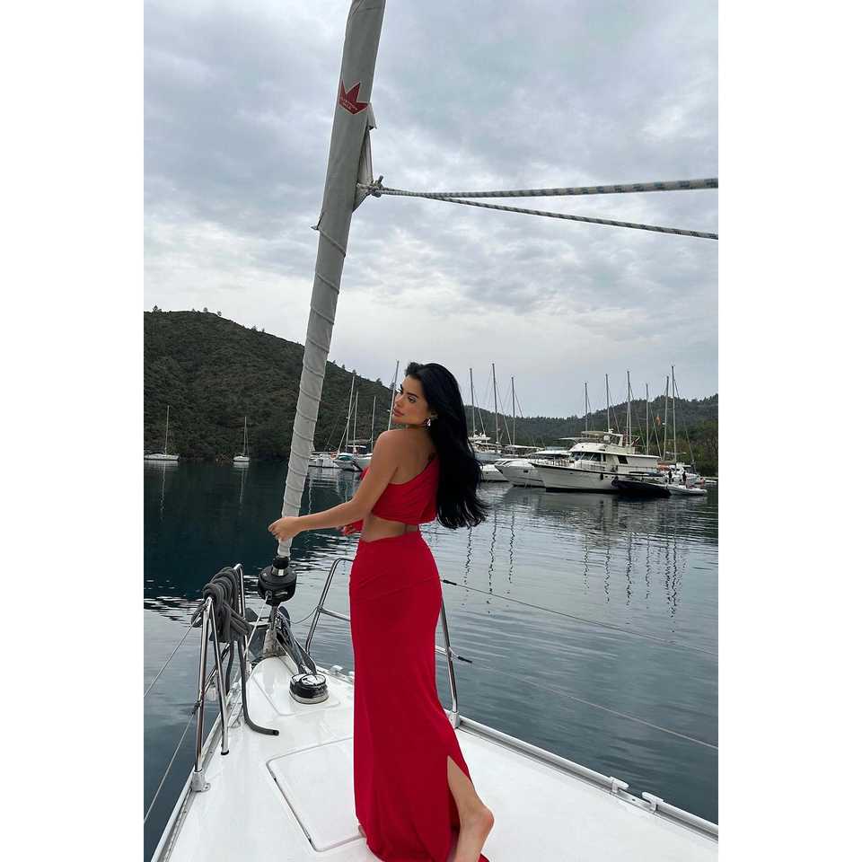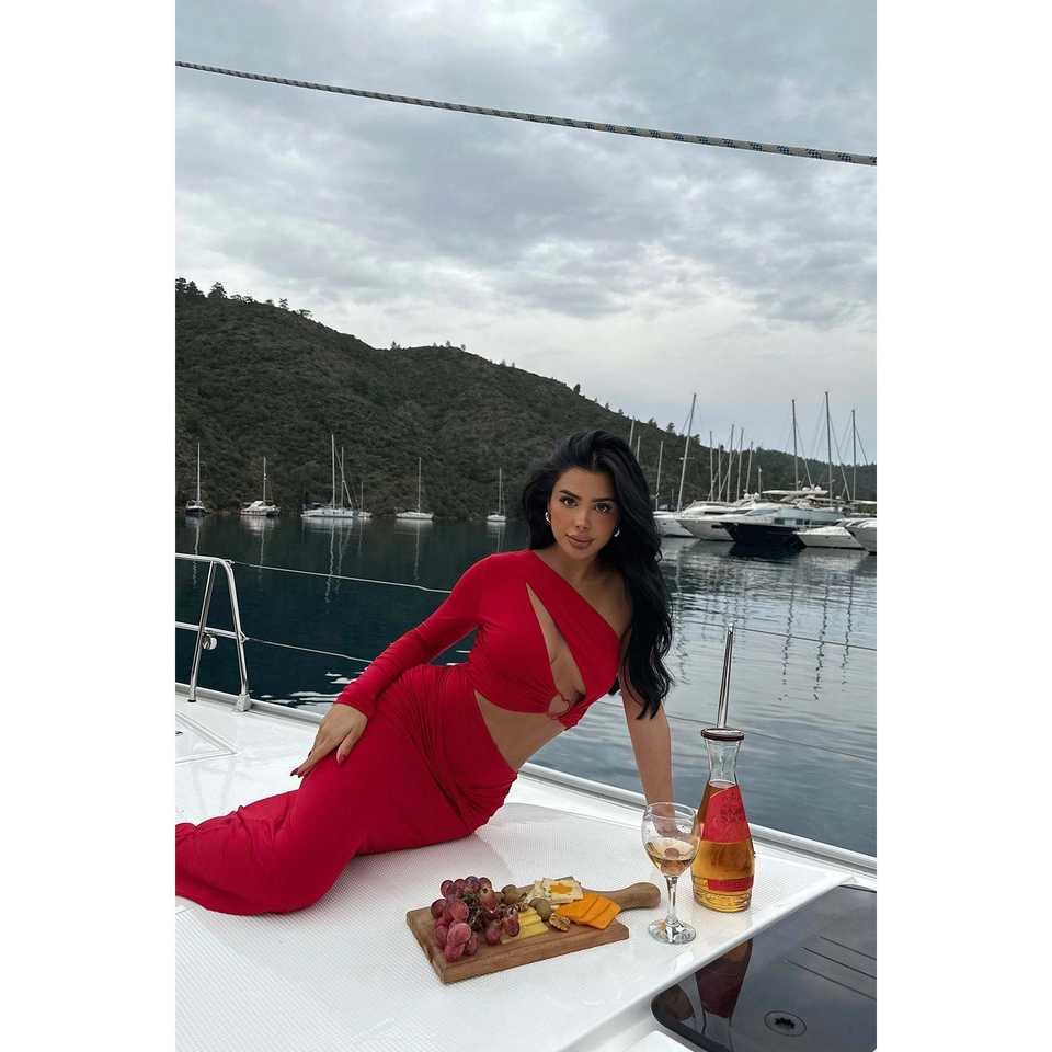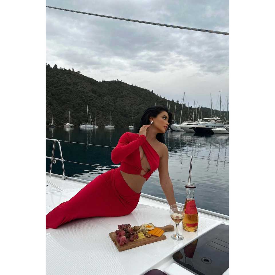 Vestido de cuero rojo con abertura en el pecho