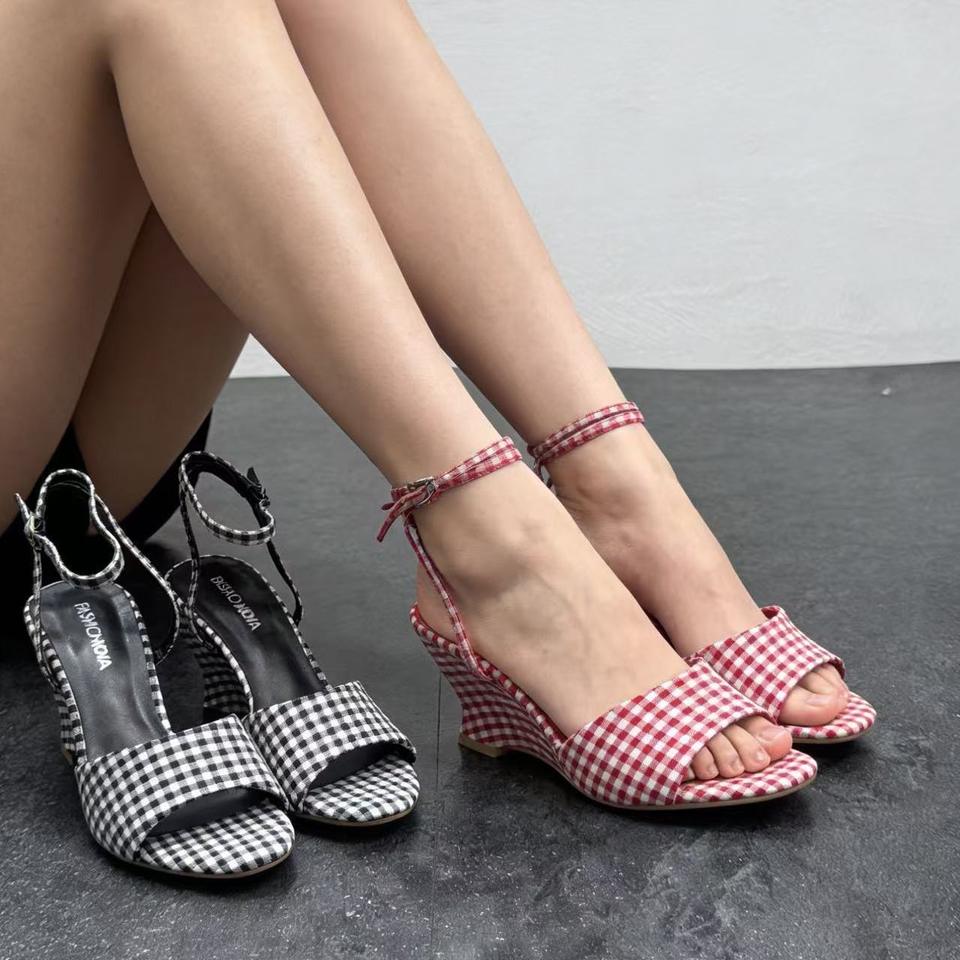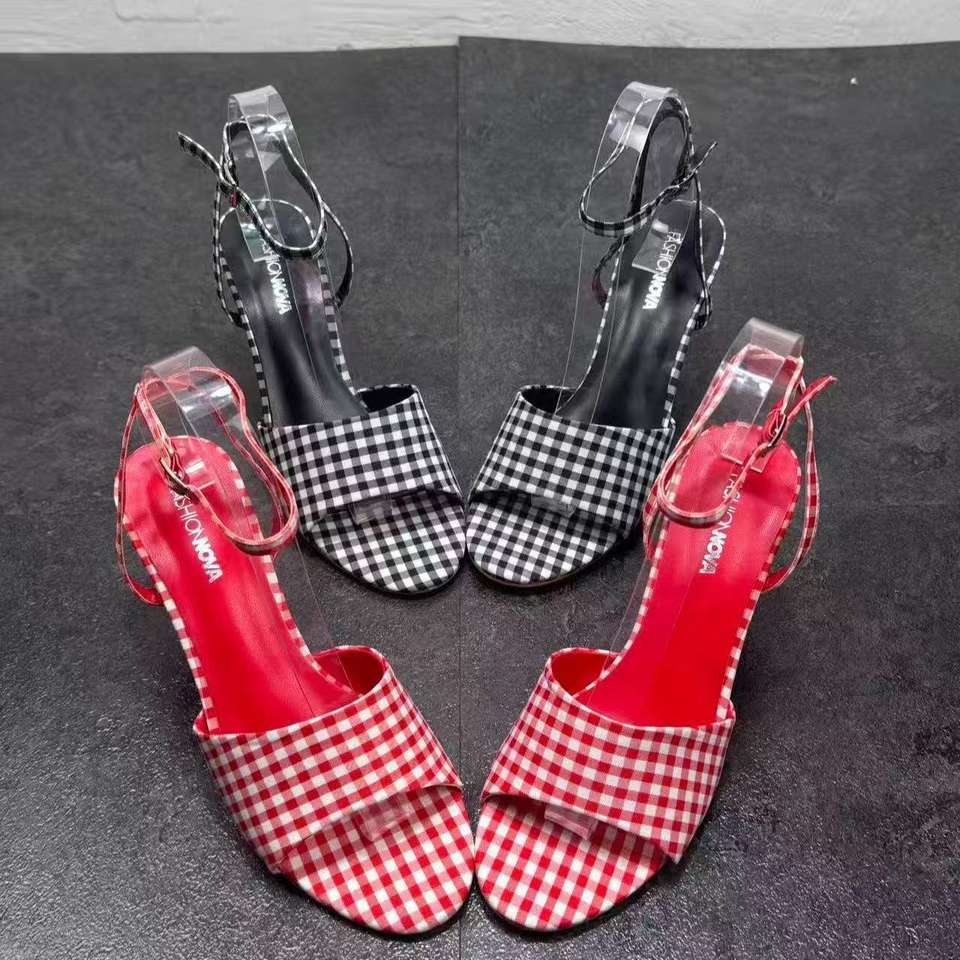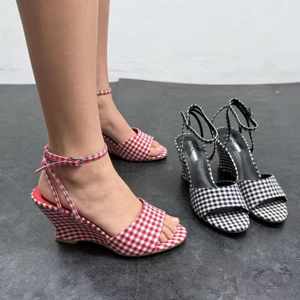Tacones Altos de Plataforma con Diseño a Cuadros Rojos y Negros, Diseño de Punta Abierta, Cómodos y Transpirables, Forma en A, Versátiles