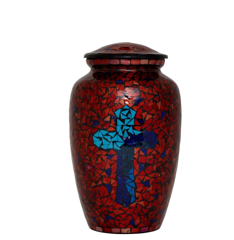 Urna funeraria hecha a mano de aluminio con cruz roja y azul para cenizas humanas, urna de entierro de tamaño adulto grande, tamaño personalizado individual aplicado a mano