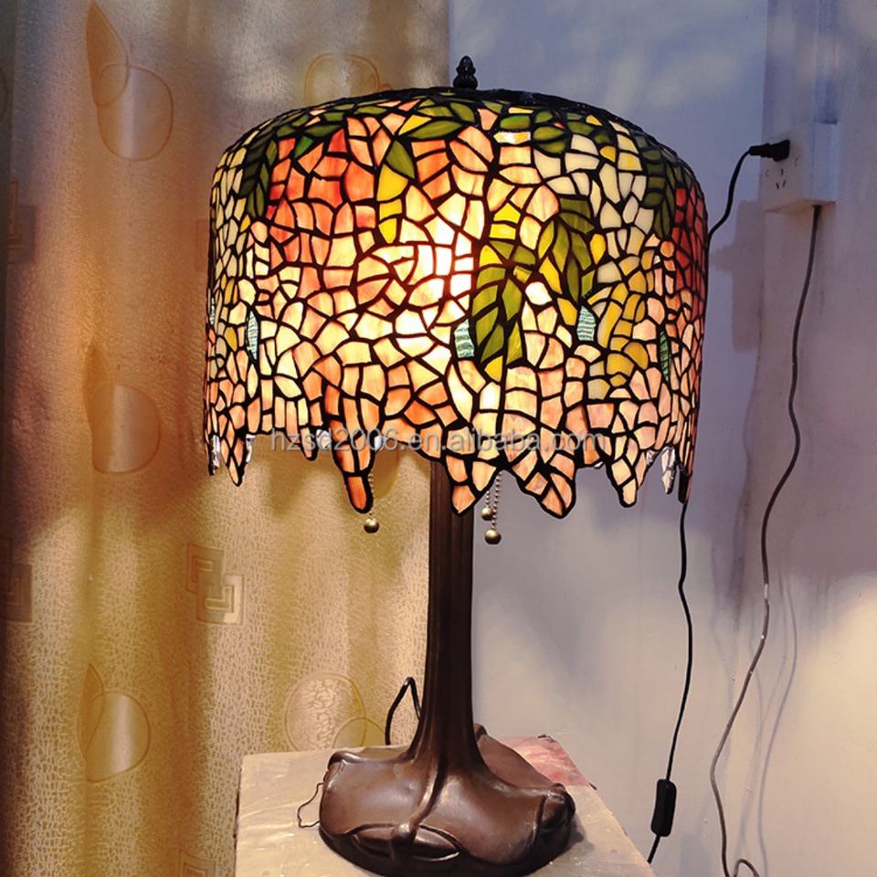 Lámpara de Mesa LED con Diseño de Glicinia China Roja, Vidrio Tiffany Hecho a Mano, Bombilla de Filamento Europea de 14'', Luz Blanca Cálida, AC E27, para el Hogar