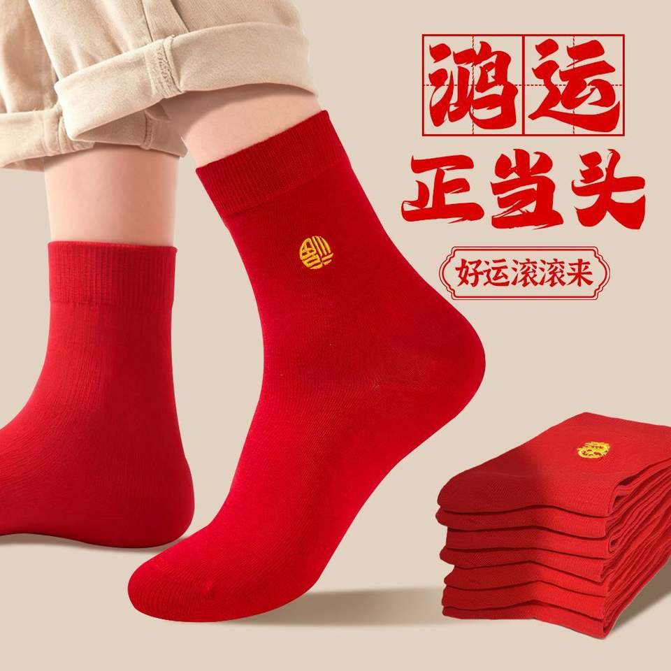 Red Crew Socks With Fortune Character Cotton Unisex Spring Casual Socks