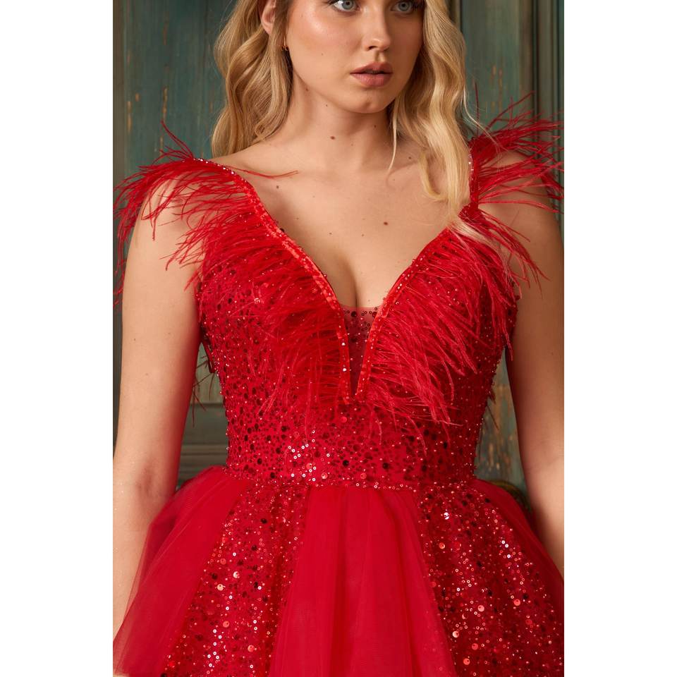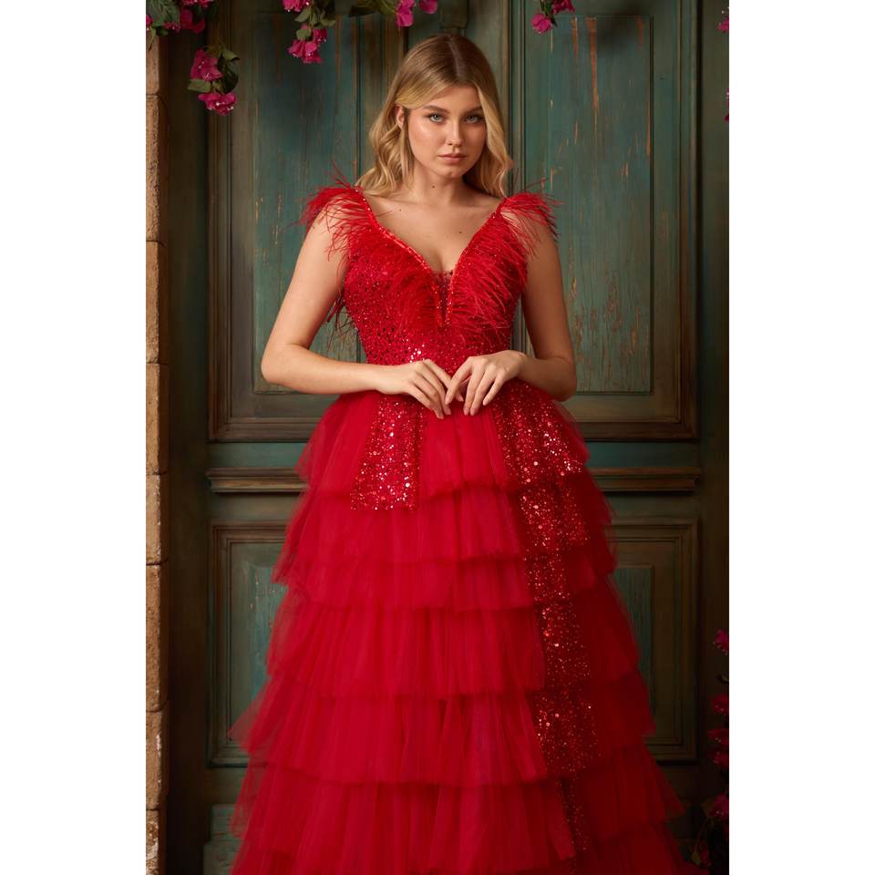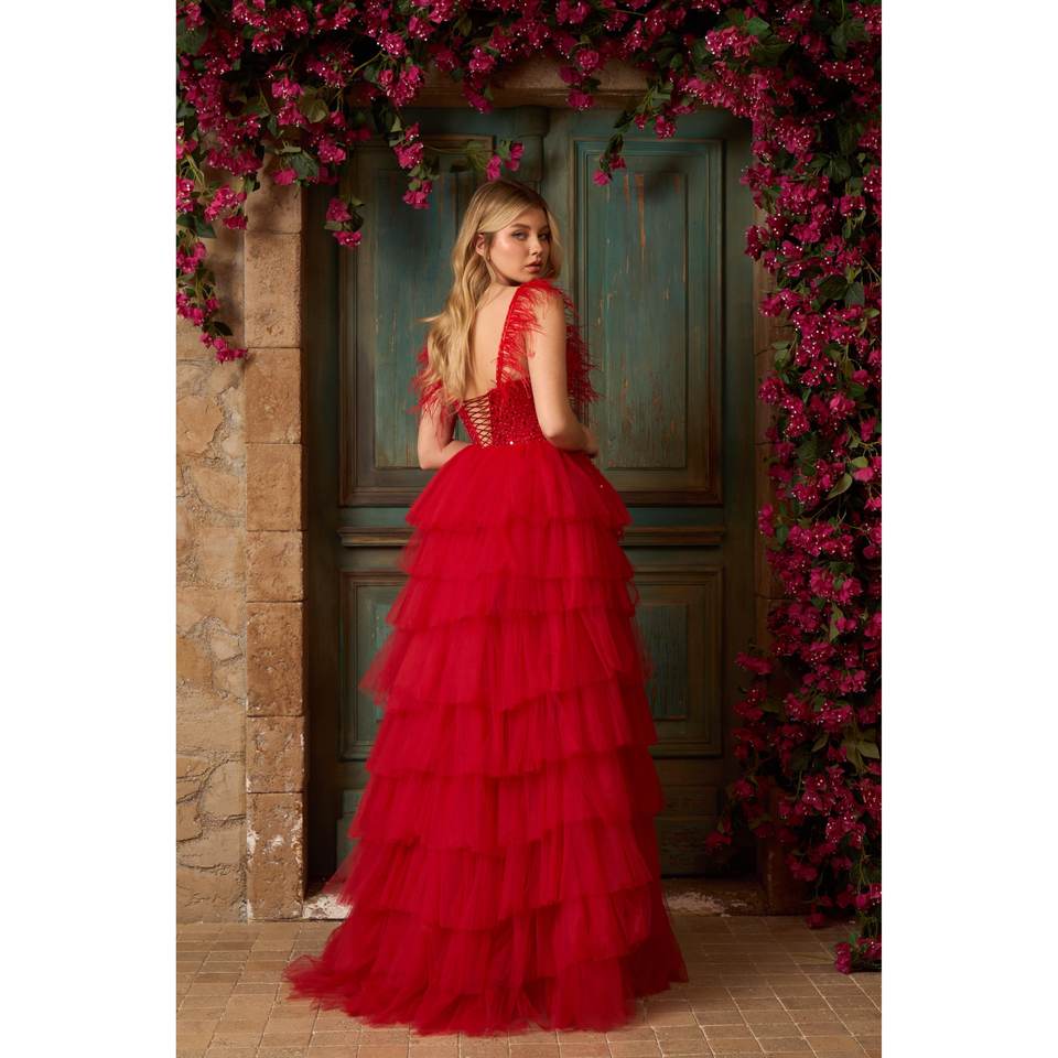Vestido de Noche y de Gala Largo de Tul con Detalles de Encaje Rojo y Plumas