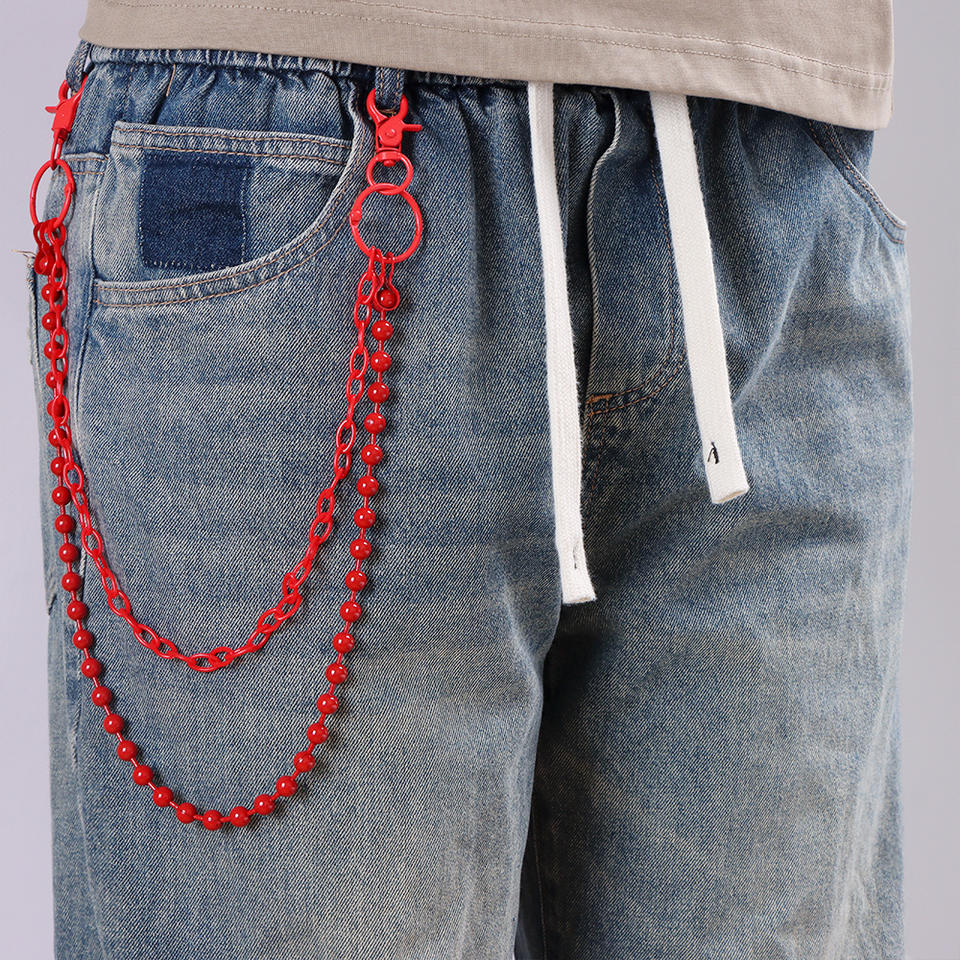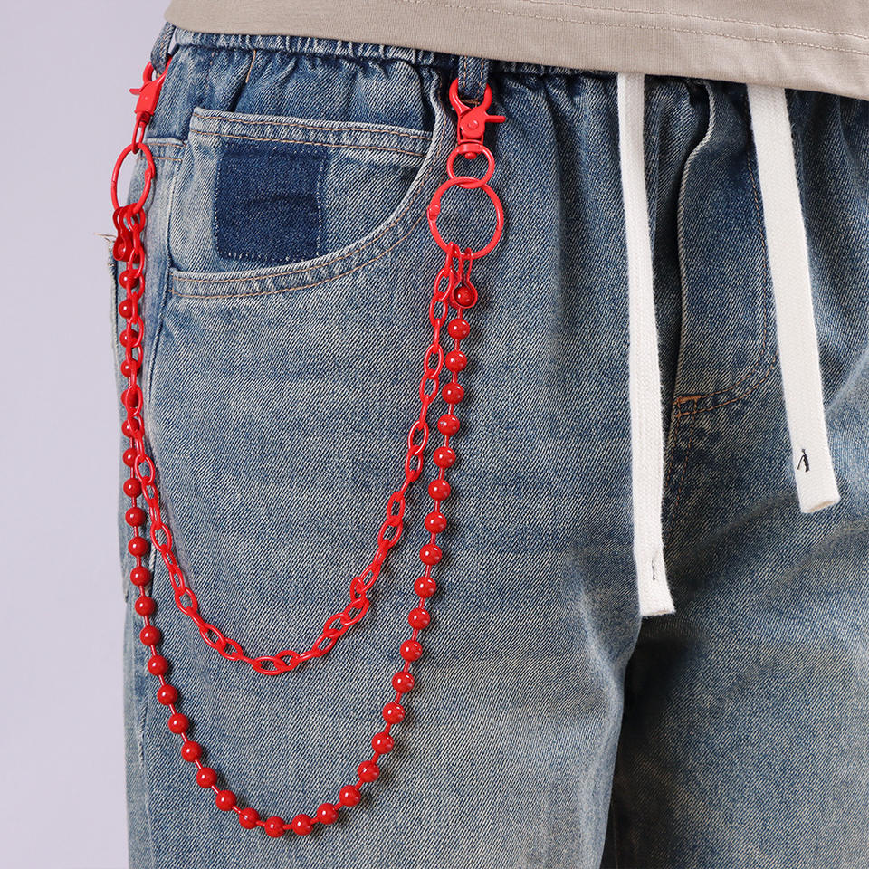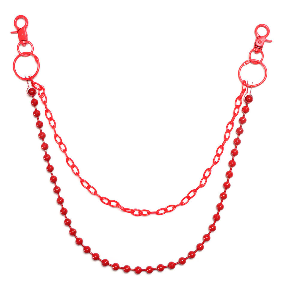 Cadena de pantalón de doble capa roja con cuentas, cadena de cintura estilo punk de aleación de zinc para jeans