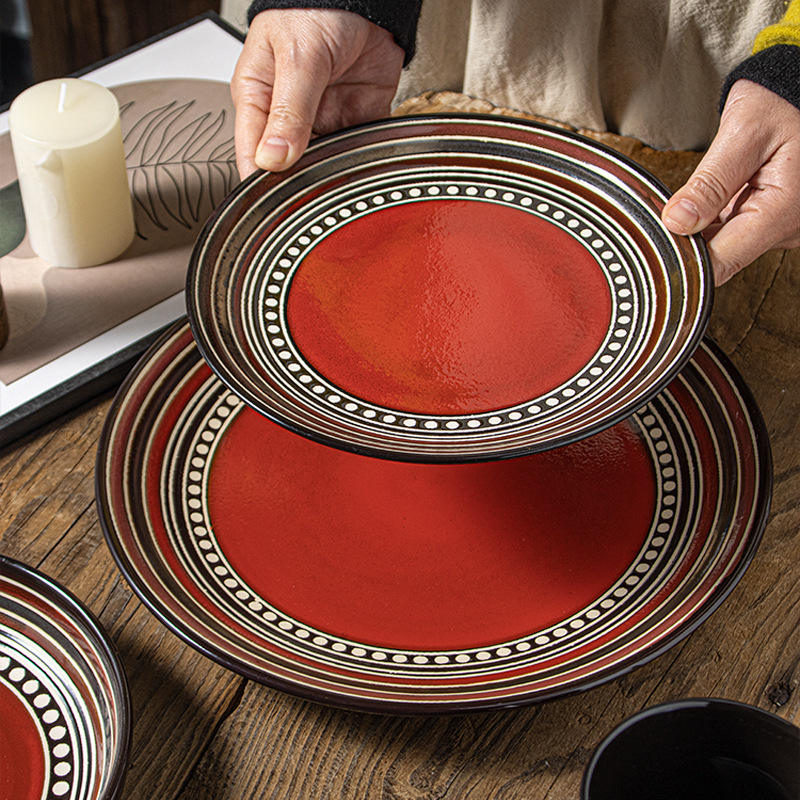 Juego de vajilla de cerámica duradera roja para el hogar, Hotel, restaurante, boda o fiesta, lavavajillas, juego de platos seguro y elegante
