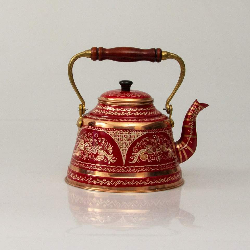 Tetera de Cobre con Diseño Floral Rojo, Decorativa y Pintada a Mano, Estilo Vintage, para Hervir Agua, Té y Café en la Estufa