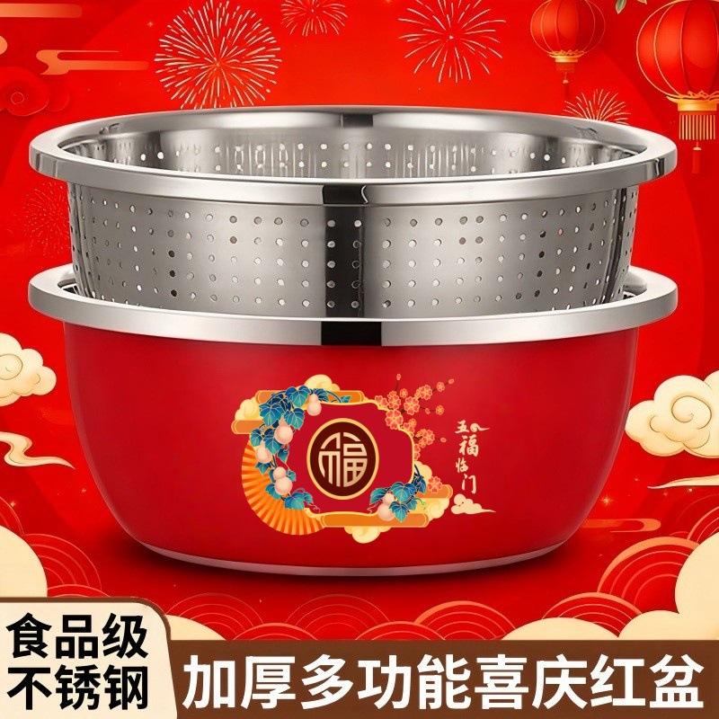 Colador de Acero Inoxidable Rojo de Grado Alimenticio, Cesta Redonda Engrosada para Lavar Verduras, Cesta de Drenaje para Enjuagar Arroz en la Cocina