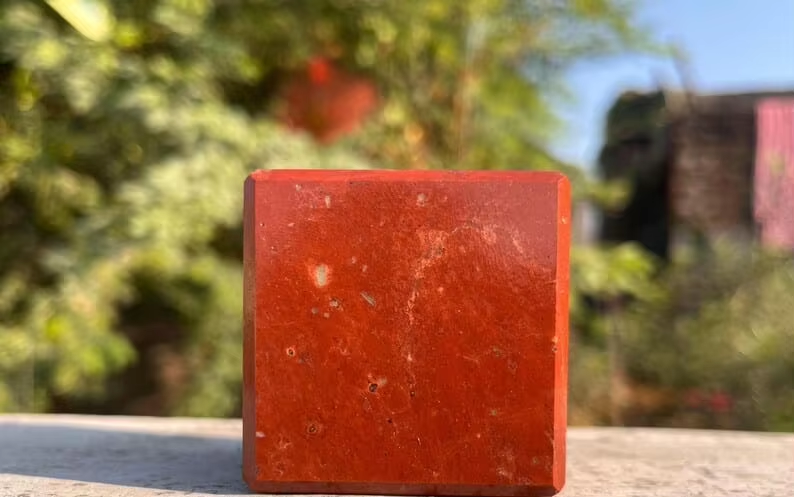 Cubo de jaspe rojo con rebanada de ágata pulida con bandas coloridas para una decoración elegante para el hogar, exhibición de oficina y energía curativa