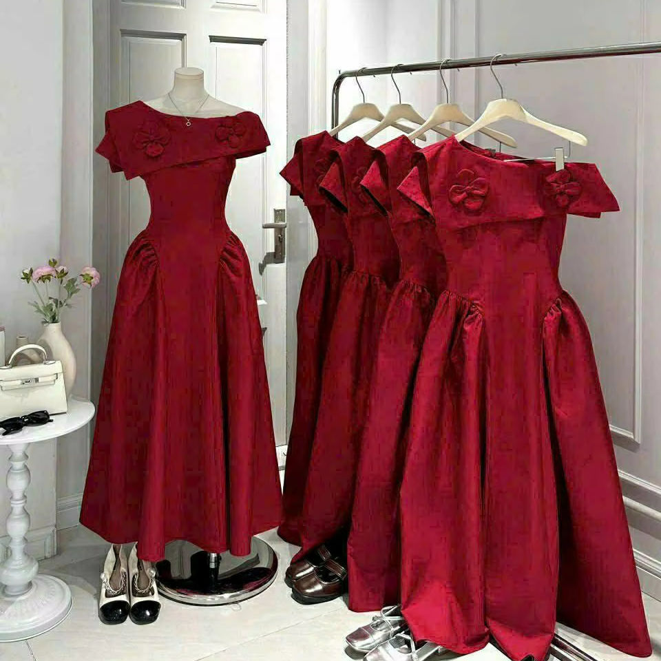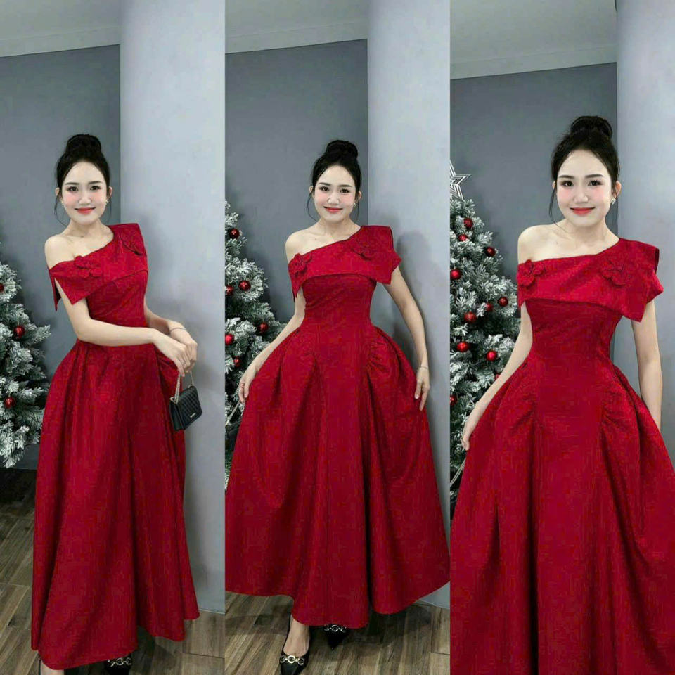 Vestido midi rojo con apliques florales de un solo hombro, vestido vietnamita de un solo hombro, floral, ligero, transpirable, elegante, de poliéster.