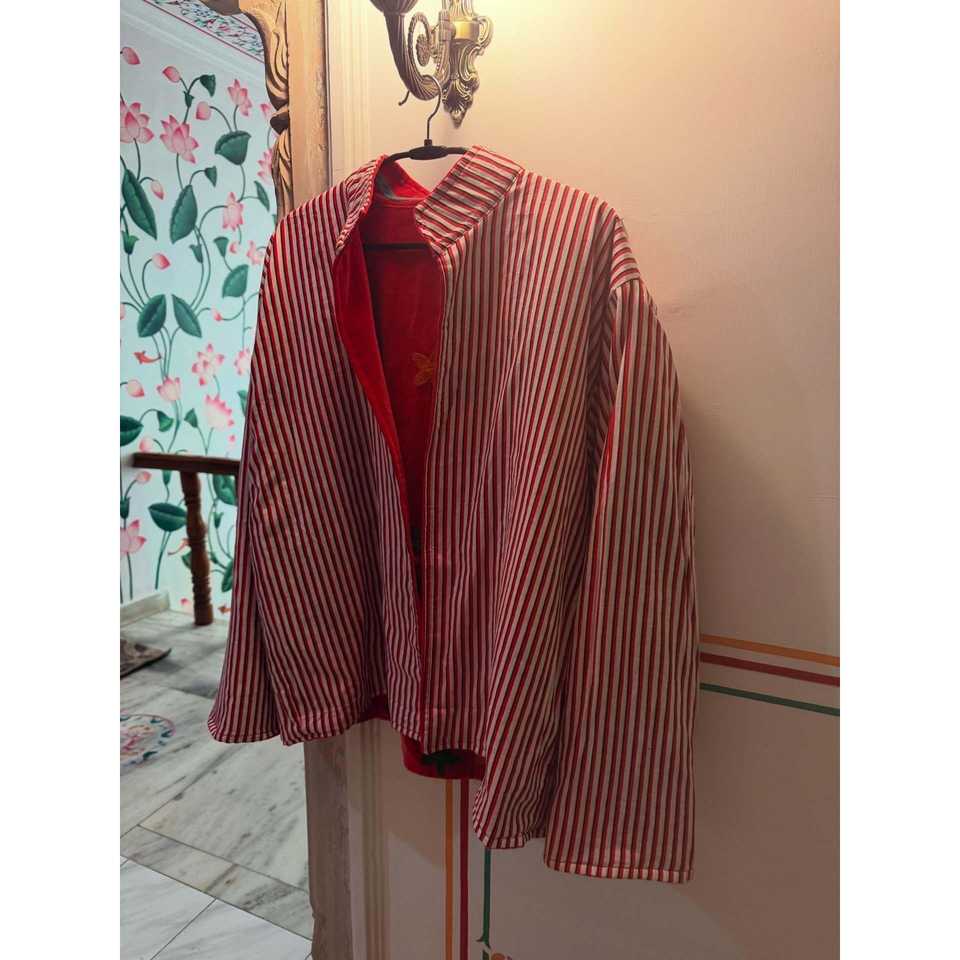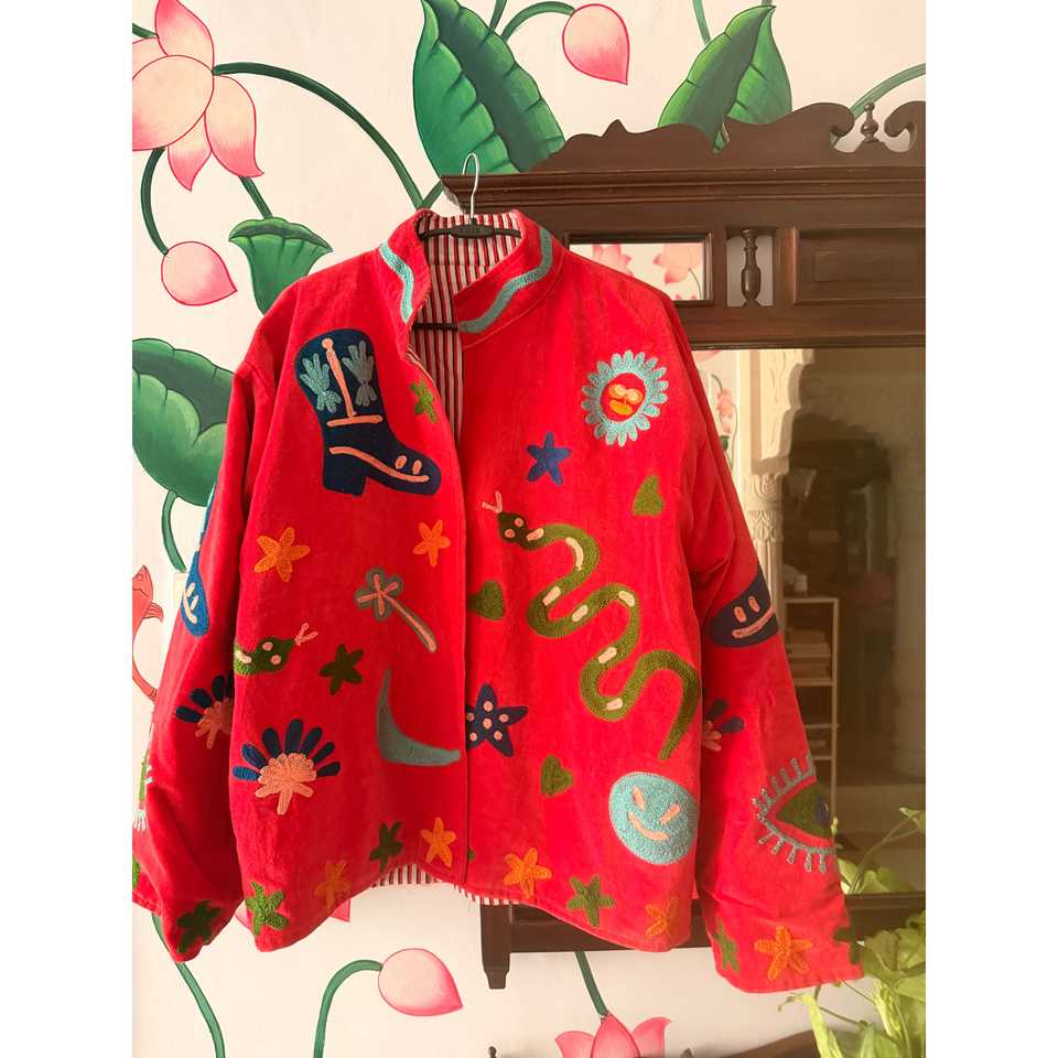 Chaqueta Bordada Roja de Terciopelo - Blazer Reversible Estilo Vintage con Estampado Floral, Cortavientos Talla XL - Relleno de Algodón para Otoño Invierno