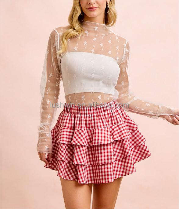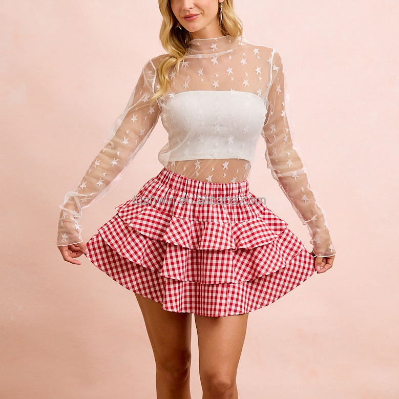 Minifalda a cuadros roja y blanca con volantes y capas para mujer, talla grande, cintura alta, informal, para verano
