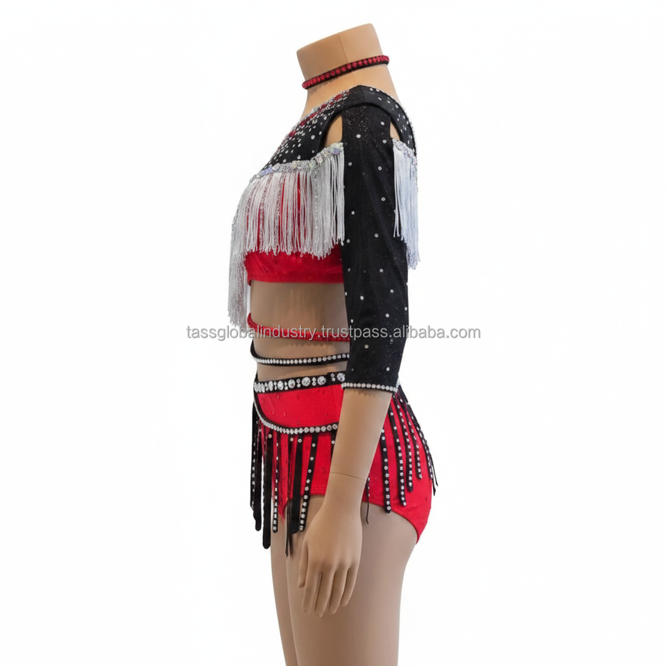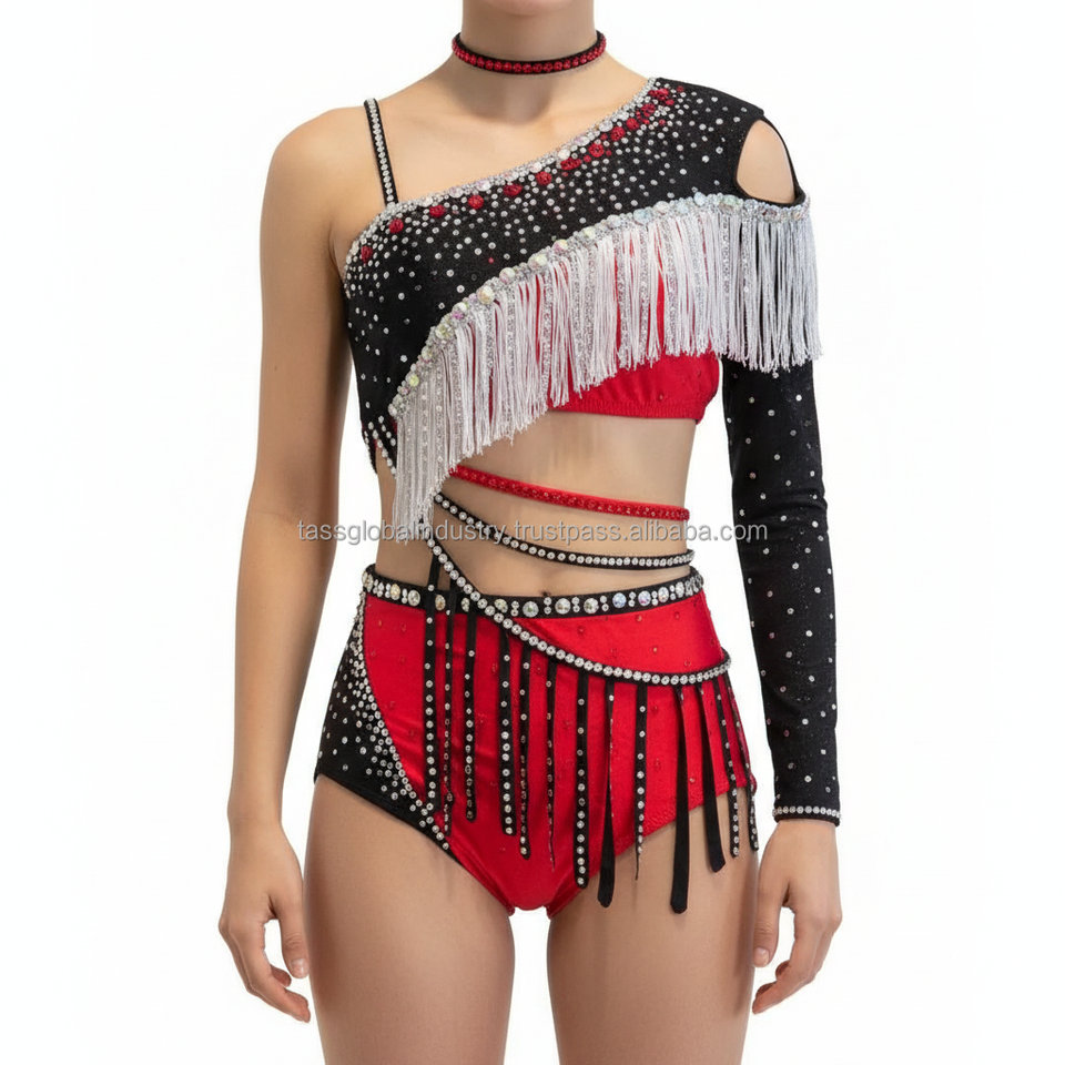 Traje de Baile con Pedrería Roja y Negra para Mujer, Asimétrico con Flecos, Brillante con Cristales, para Actuaciones de Samba Latina
