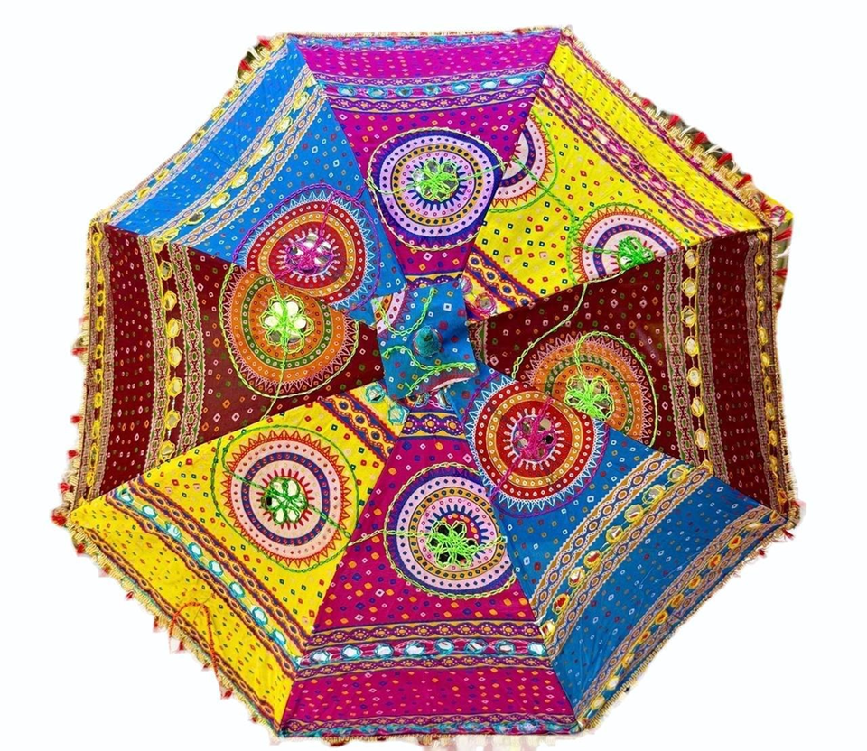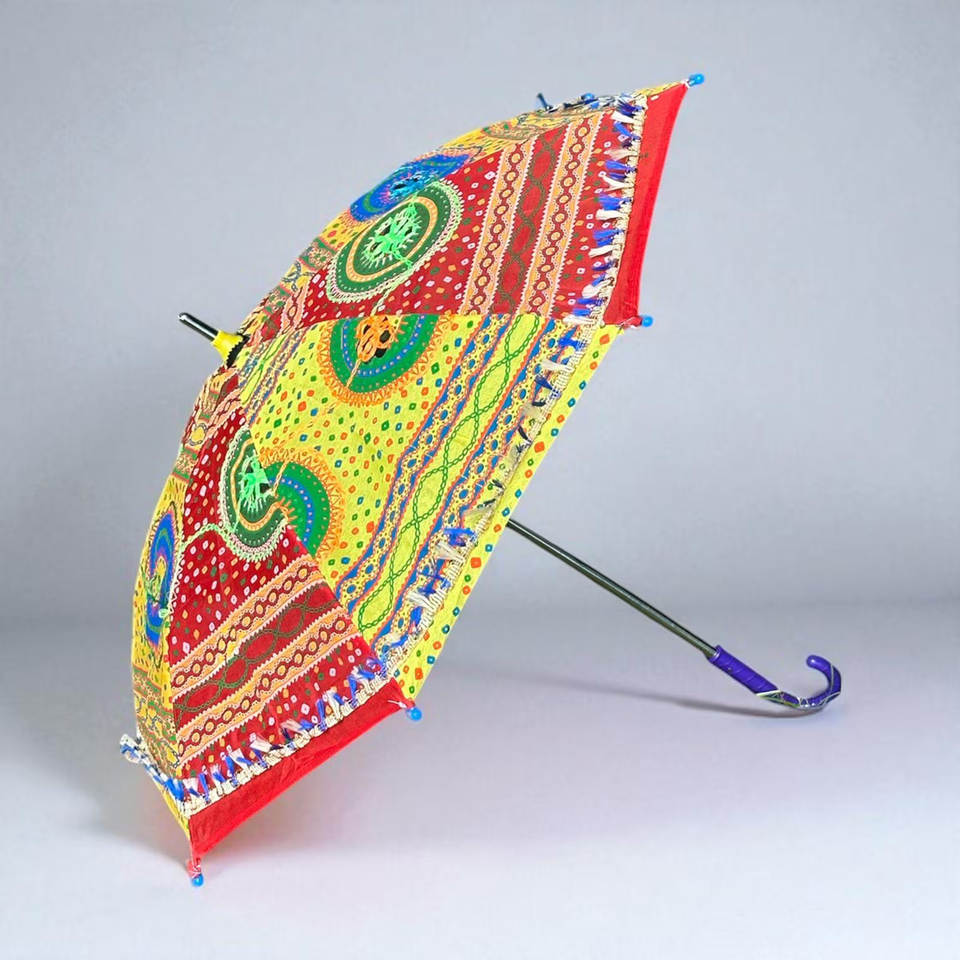 Sombrilla tradicional rajastaní bandhani con retazos rojos y amarillos, detalles de espejo, disponible a precios de mayoreo.