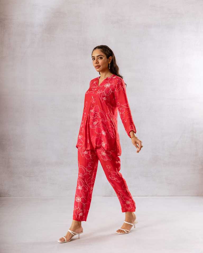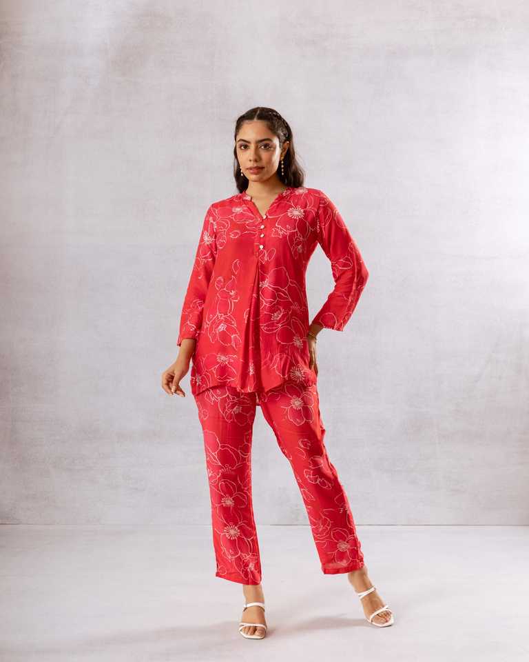 Conjunto de dos piezas con estampado floral de color rojo con cuello en V Estilo Kurta Top y pantalón de piernas anchas Conjunto de algodón Precio al por mayor a granel