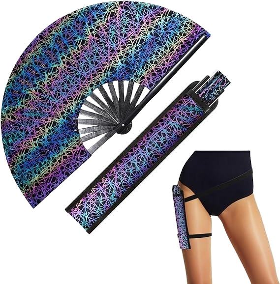 Abanico Plegable de Bambú Holográfico Reflectante Grande con Funda para Eventos y Fiestas Rave